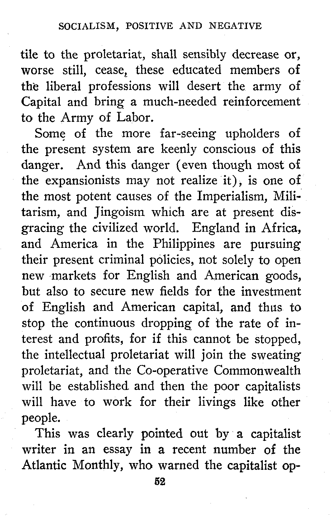 Some of the more far-seeing upholders of the present system are keenly conscious of this danger. And this danger (even though most of the expansionists may not realize it), is one of the most potent causes of the Imperialism, Militarism, and Jingoism which are at present disgracing the civilized world. England in Africa, and America in the Philippines are pursuing their present criminal policies, not solely to open new markets for English and American goods, but also to secure new fields for the investment of English and American capital, and thus to stop the continuous dropping of the rate of interest and profits, for if this cannot be stopped, the intellectual proletariat will join the sweating proletariat, and the Co-operative Commonwealth will be established and then the poor capitalists will have to work for their livings like other people.