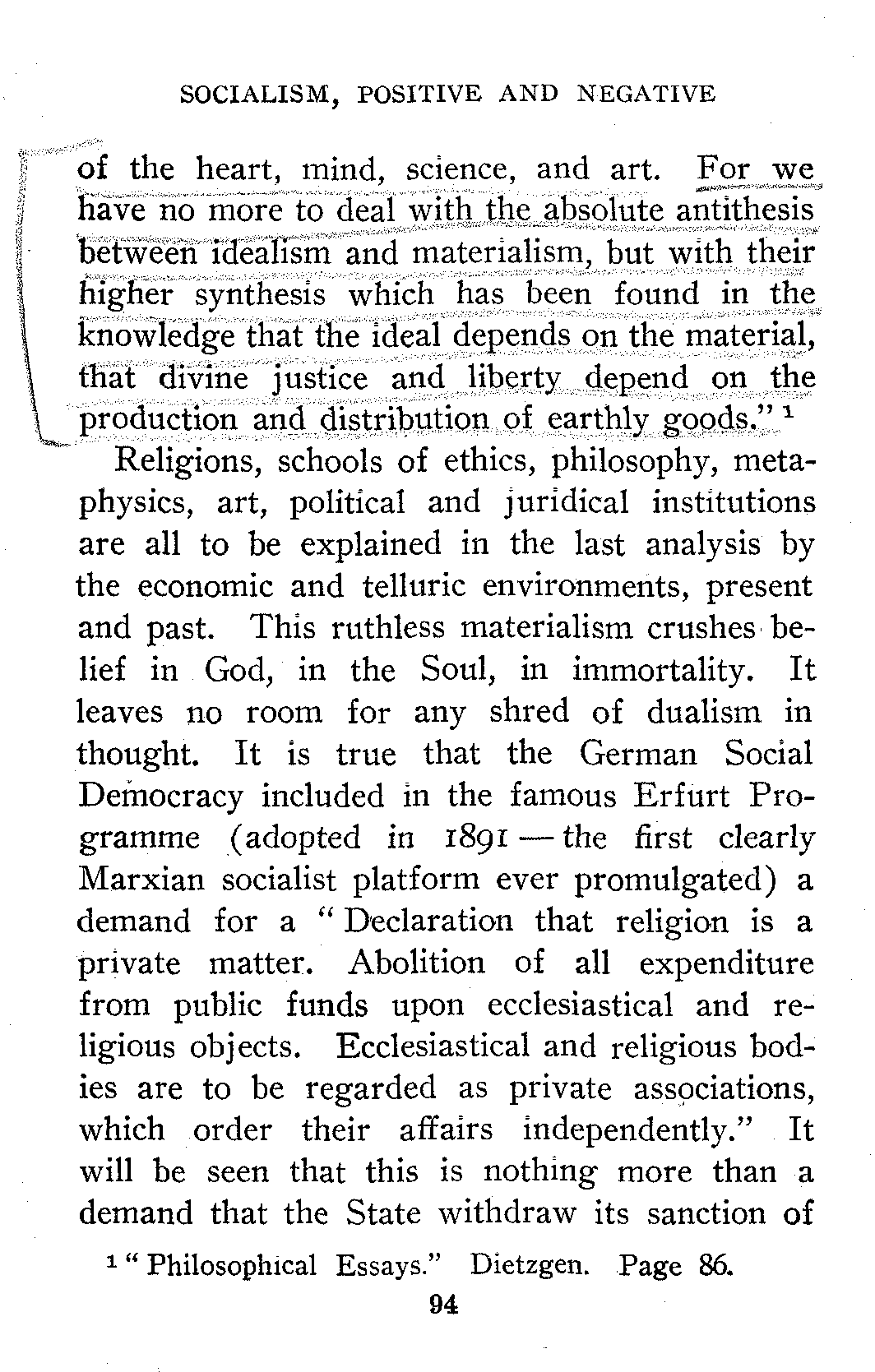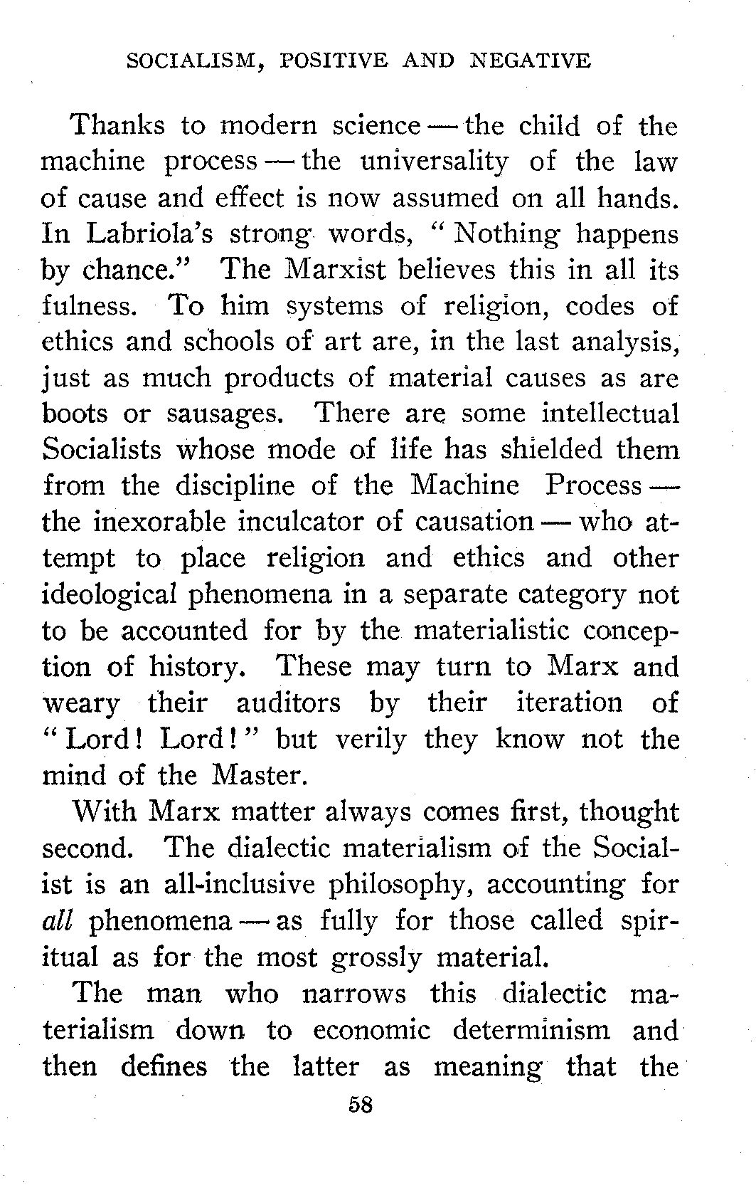 I am aware of the fact that in the Preface of his "Socialism, Utopian and Scientific," Engels apparently identifies the Materialistic Conception[28] of History with Materialistic Monism in Philosophy, but this connection or identification is not a necessary logical consequence of any statement of the Materialistic Conception of History I have been able to find by Engels, Marx, Deville, Ferri, Loria, or any Marxian of authority and to thus identify it, is detrimental to the cause of Socialism, since many people who would not hesitate to admit the predominance of the economic factor, instantly revolt at the idea of Materialism.