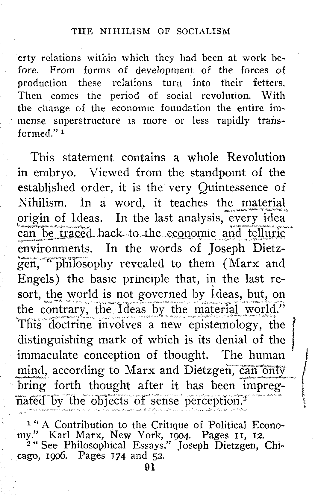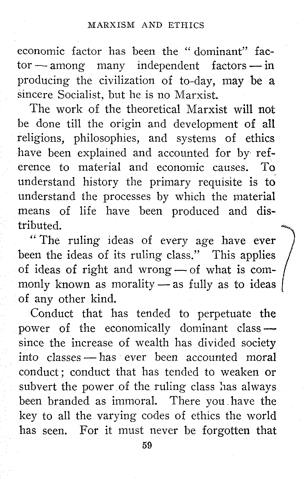 "The laws, customs, education, public opinion and morals are controlled and shaped by economic conditions, or, in other words, by the dominant ruling class which the economic [29]system of any given period forces to the front. The ruling ideas of each age have been the ideas of its ruling class, whether that class was the patricians of ancient Rome, the feudal barons of the middle ages, or the capitalists of modern times. The economic structure of society largely controls and shapes all social institutions, and also religious and philosophical ideas."