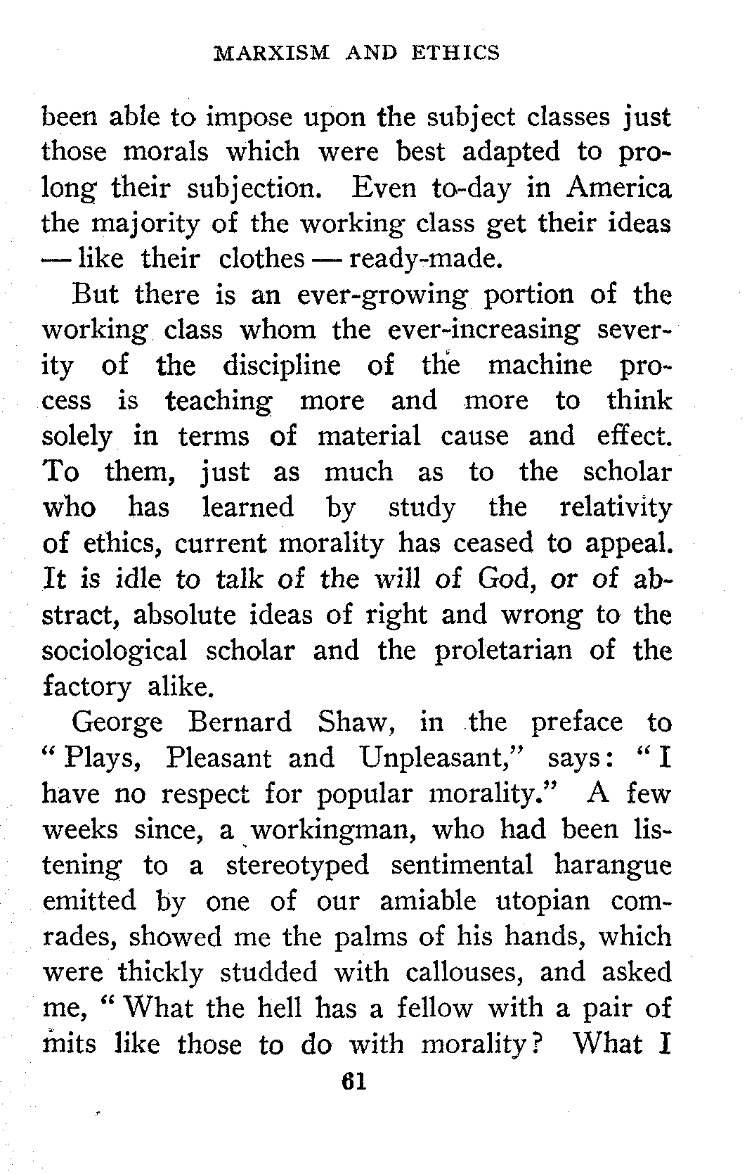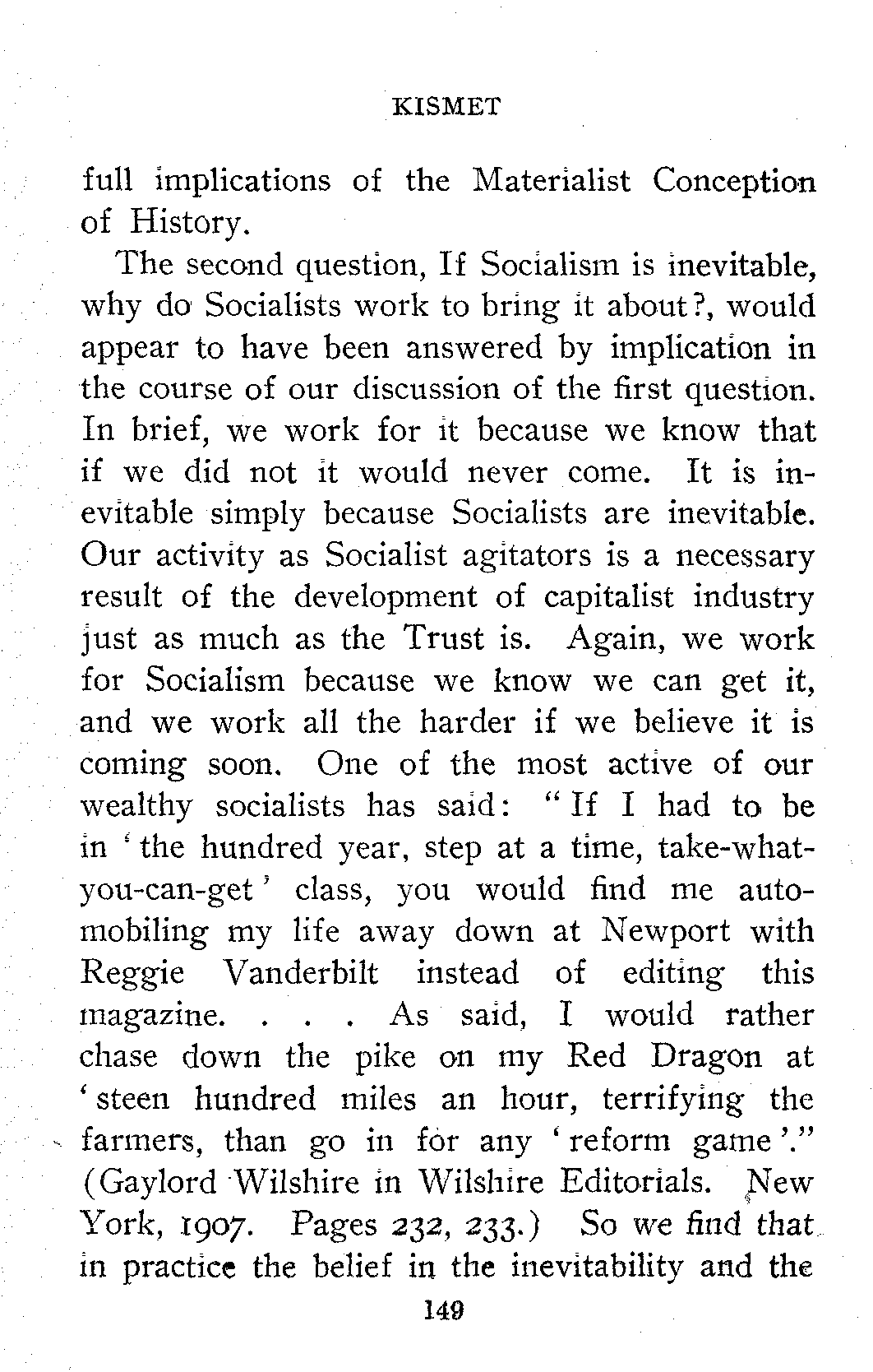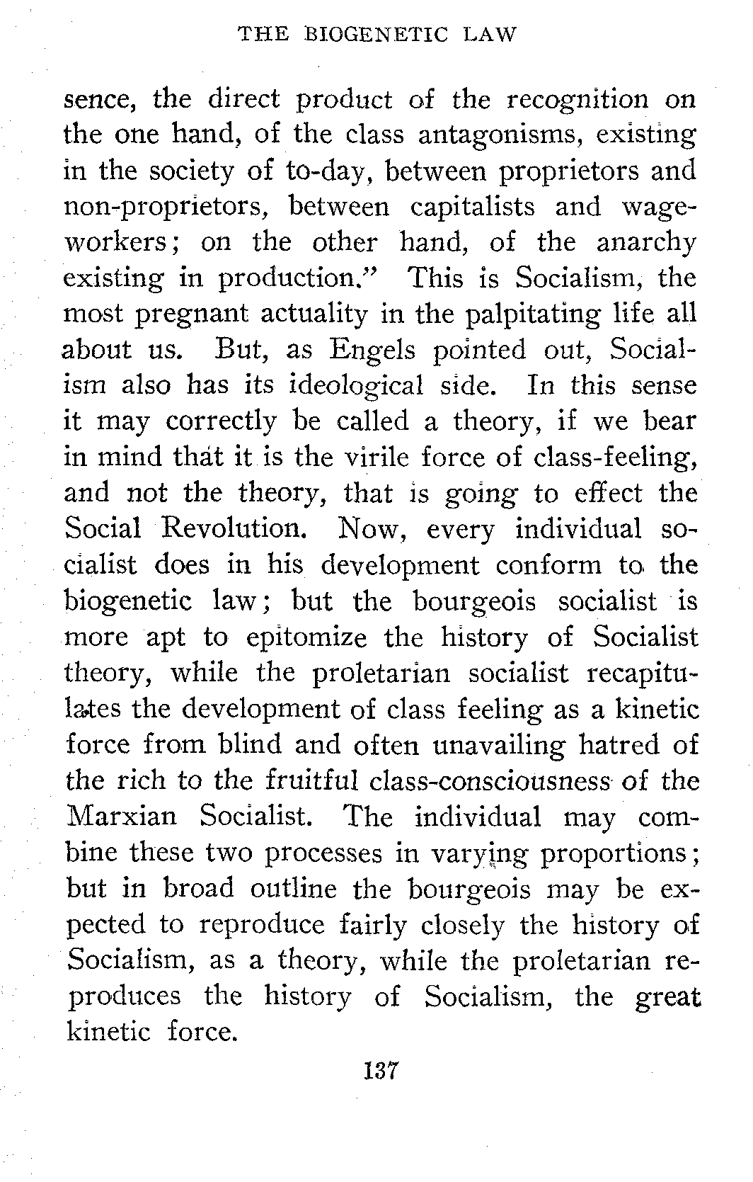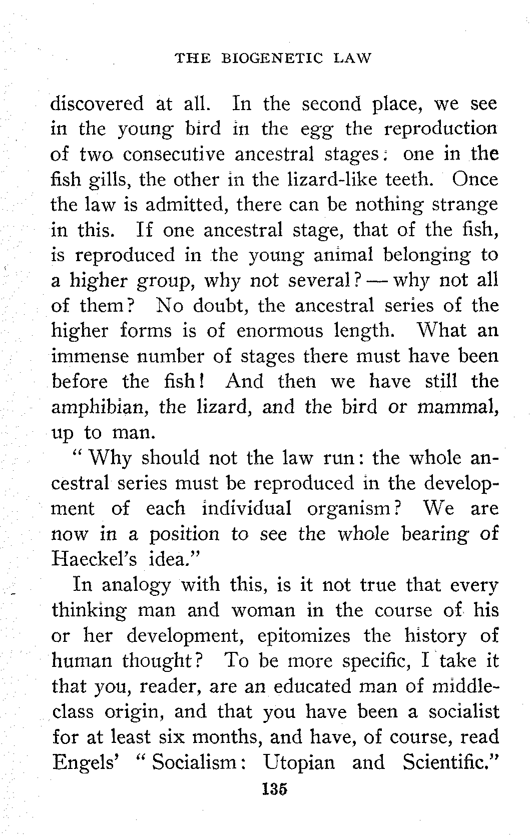 The general acceptance of the idea that all things change, that property, marriage, religion, etc., are in process of evolution and are destined to take on new forms prepared the way for Socialism. A man who has read Wallace and Darwin is ready to read Marx and Engels.