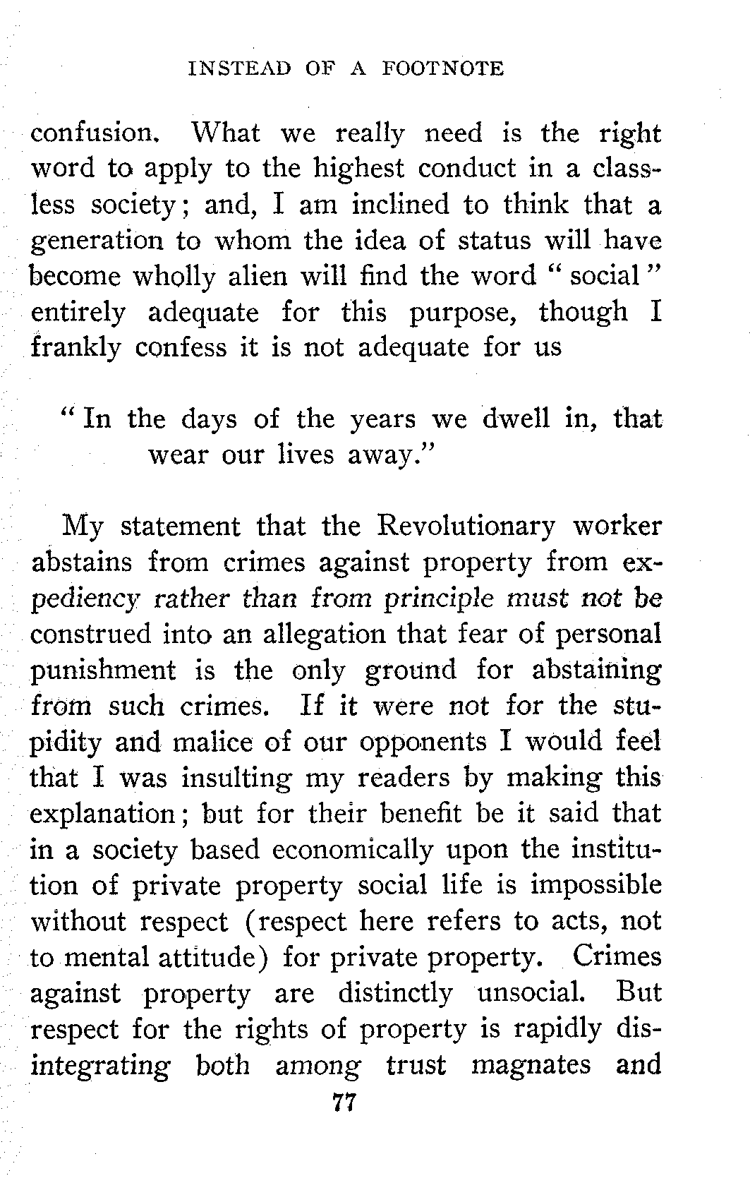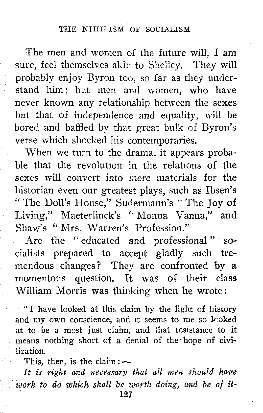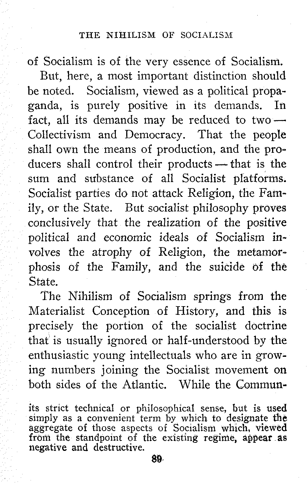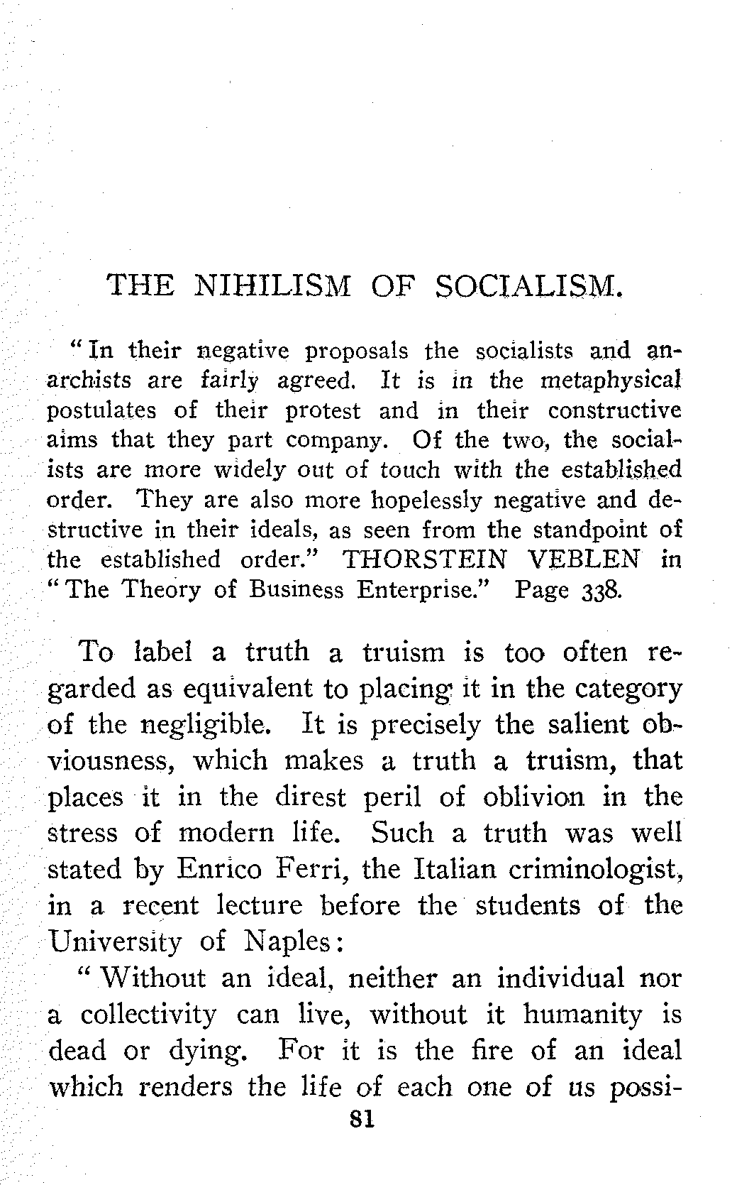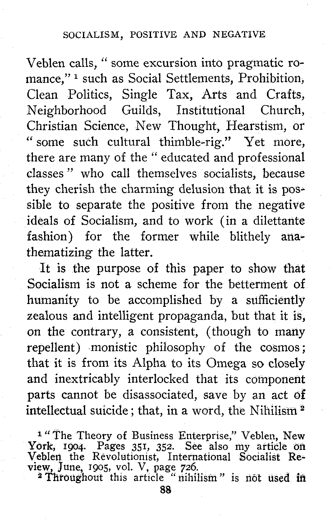 Some Socialists will deprecate what may seem to them the unwise frankness of the paper on "The Nihilism of Socialism." To them I can only say that to me Socialism has always been essentially a revolutionary movement. Revolutionists, who attempt to maintain a distinction between their exoteric and their esoteric teachings, only succeed in making themselves ridiculous. But, even were the maintenance of such a distinction practicable, it would, in my judgment, be highly inexpedient. As a mere matter of policy, ever since I first entered the Socialist Movement, I have been a firm believer in the tactics admirably summed up in Danton's "De l'audace! Puis de l'audace! Et toujours de l'audace!"