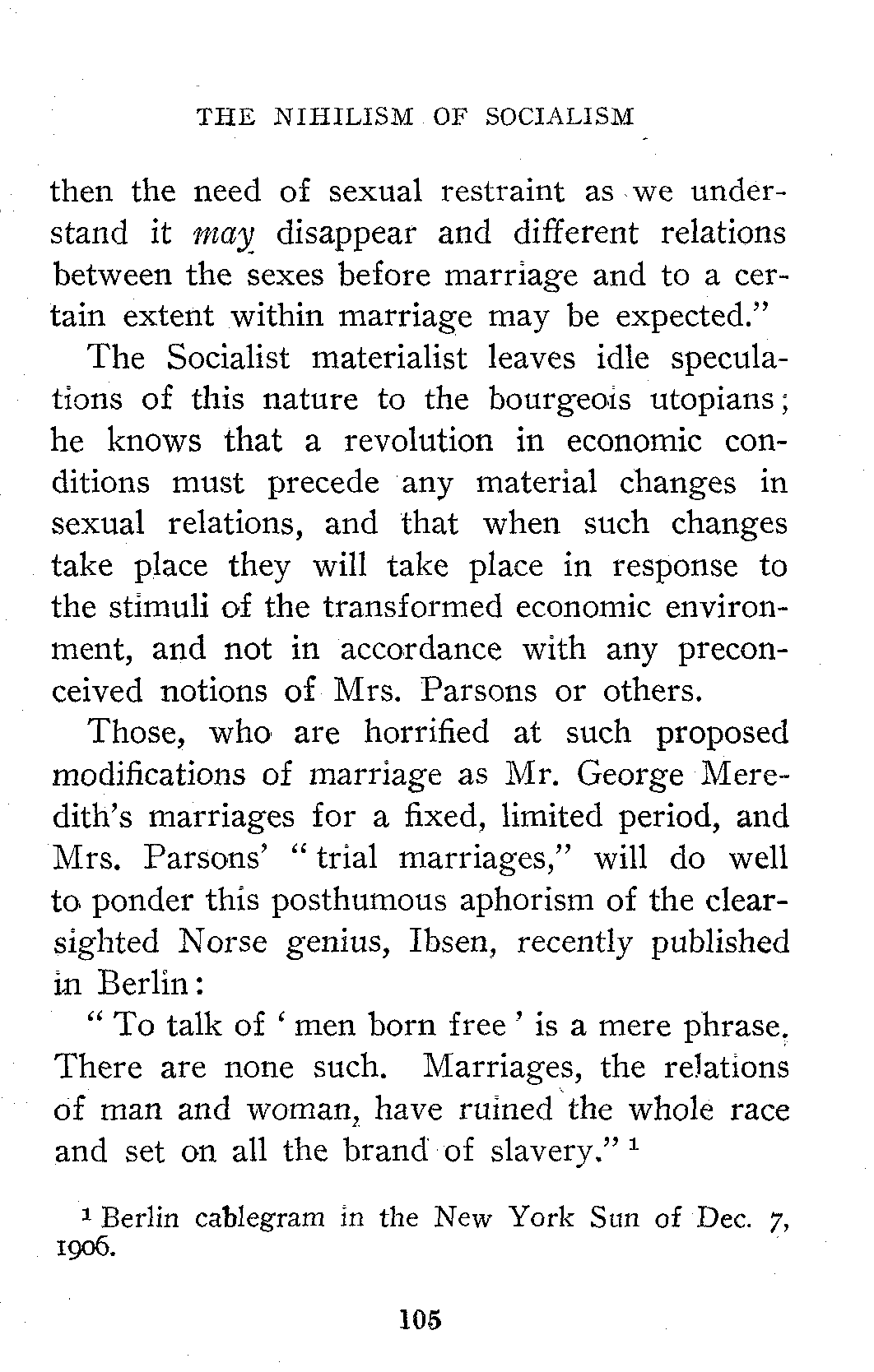 There is an obvious inconsistency between the treatment of Materialism in "Science and Socialism" and its treatment in "The Nihilism of Socialism." I would point out that seven years elapsed between the composition of the former and that of the latter essay. Whether the inconsistency be a sign of mental growth or deterioration my readers must judge for themselves. I will merely say here that the man or woman, whose views remain absolutely fixed and stereotyped for seven years, is cheating the undertaker. What I conceive the true [8]significance of this particular change in opinions to be is set forth in the essay on "The Biogenetic Law."