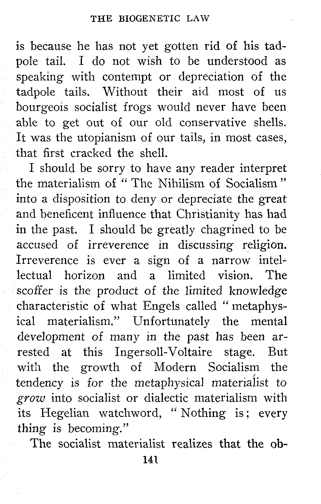Should any reader find himself repelled by "The Nihilism of Socialism," let me beg that he will not put the book aside until he has read the essay on "The Biogenetic Law."