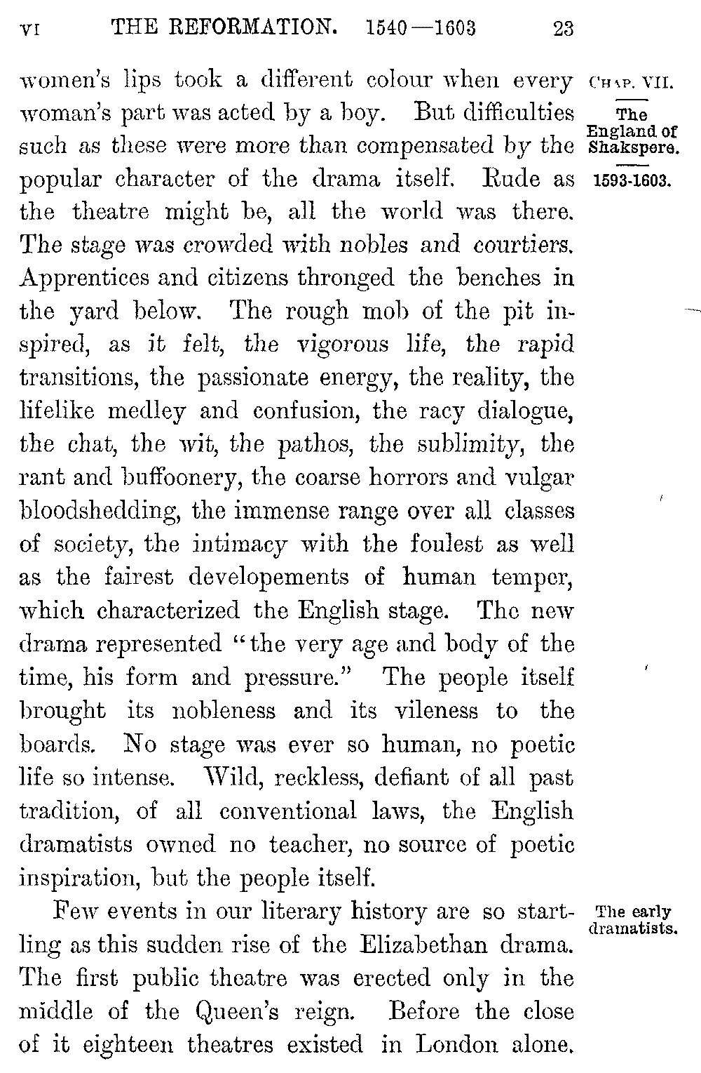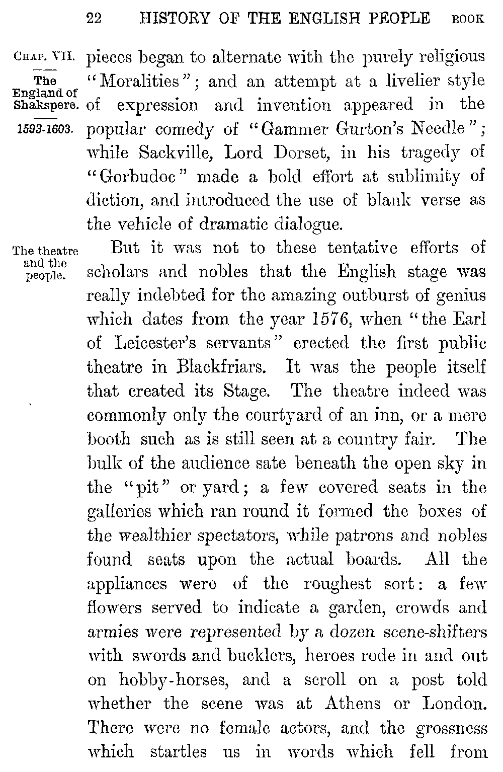 But it was not to these tentative efforts of scholars and nobles that the English stage was really indebted for the amazing outburst of genius which dates from the year 1576, when "the Earl of Leicester's servants" erected the first public theatre in Blackfriars. It was the people itself that created its Stage. The theatre indeed was commonly only the courtyard of an inn, or a mere booth such as is still seen at a country fair. The bulk of the audience sate beneath the open sky in the "pit" or yard; a few covered seats in the galleries which ran round it formed the boxes of the wealthier spectators, while patrons and nobles found seats upon the actual boards. All the appliances were of the roughest sort: a few flowers served to indicate a garden, crowds and armies were represented by a dozen scene-shifters with swords and bucklers, heroes rode in and out on hobby-horses, and a scroll on a post told whether the scene was at Athens or London. There were no female actors, and the grossness which startles us in words which fell from 5-023]women's lips took a different colour when every woman's part was acted by a boy. But difficulties such as these were more than compensated by the popular character of the drama itself. Rude as the theatre might be, all the world was there. The stage was crowded with nobles and courtiers. Apprentices and citizens thronged the benches in the yard below. The rough mob of the pit inspired, as it felt, the vigorous life, the rapid transitions, the passionate energy, the reality, the lifelike medley and confusion, the racy dialogue, the chat, the wit, the pathos, the sublimity, the rant and buffoonery, the coarse horrors and vulgar bloodshedding, the immense range over all classes of society, the intimacy with the foulest as well as the fairest developements of human temper, which characterized the English stage. The new drama represented "the very age and body of the time, his form and pressure." The people itself brought its nobleness and its vileness to the boards. No stage was ever so human, no poetic life so intense. Wild, reckless, defiant of all past tradition, of all conventional laws, the English dramatists owned no teacher, no source of poetic inspiration, but the people itself.
