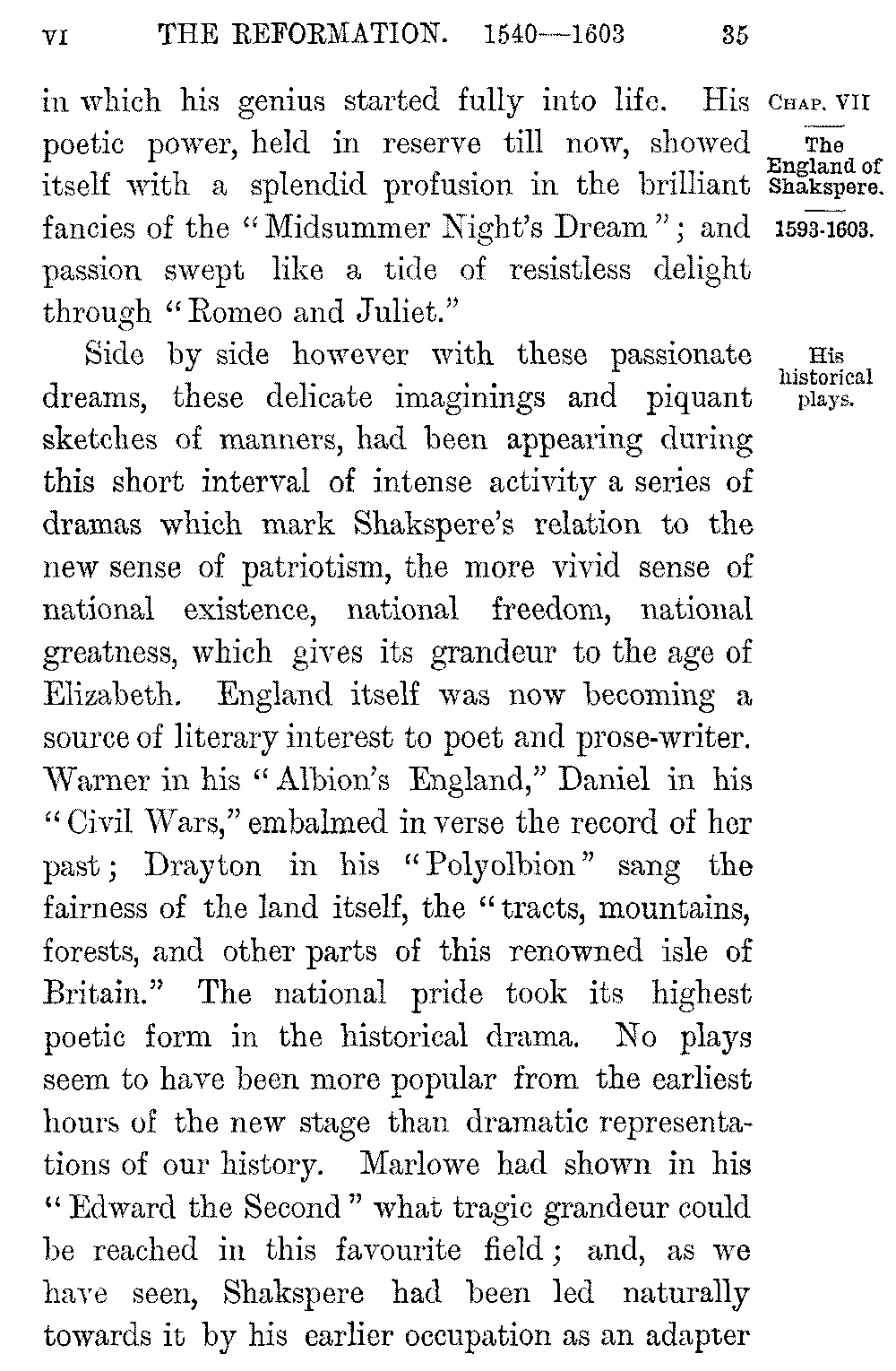 Side by side however with these passionate dreams, these delicate imaginings and piquant sketches of manners, had been appearing during this short interval of intense activity a series of dramas which mark Shakspere's relation to the new sense of patriotism, the more vivid sense of national existence, national freedom, national greatness, which gives its grandeur to the age of Elizabeth. England itself was now becoming a source of literary interest to poet and prose-writer. Warner in his "Albion's England," Daniel in his "Civil Wars," embalmed in verse the record of her past; Drayton in his "Polyolbion" sang the fairness of the land itself, the "tracts, mountains, forests, and other parts of this renowned isle of Britain." The national pride took its highest poetic form in the historical drama. No plays seem to have been more popular from the earliest hours of the new stage than dramatic representations of our history. Marlowe had shown in his "Edward the Second" what tragic grandeur could be reached in this favourite field; and, as we have seen, Shakspere had been led naturally towards it by his earlier occupation as an adapter 5-036]of stock pieces like "Henry the Sixth" for the new requirements of the stage. He still to some extent followed in plan the older plays on the subjects he selected, but in his treatment of their themes he shook boldly off the yoke of the past. A larger and deeper conception of human character than any of the old dramatists had reached displayed itself in Richard the Third, in Falstaff, or in Hotspur; while in Constance and Richard the Second the pathos of human suffering was painted as even Marlowe had never dared to paint it.