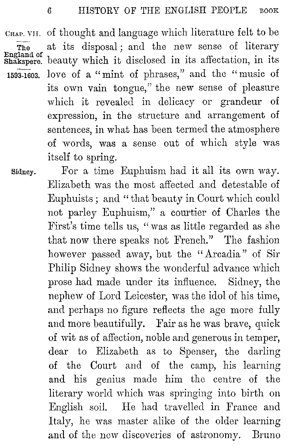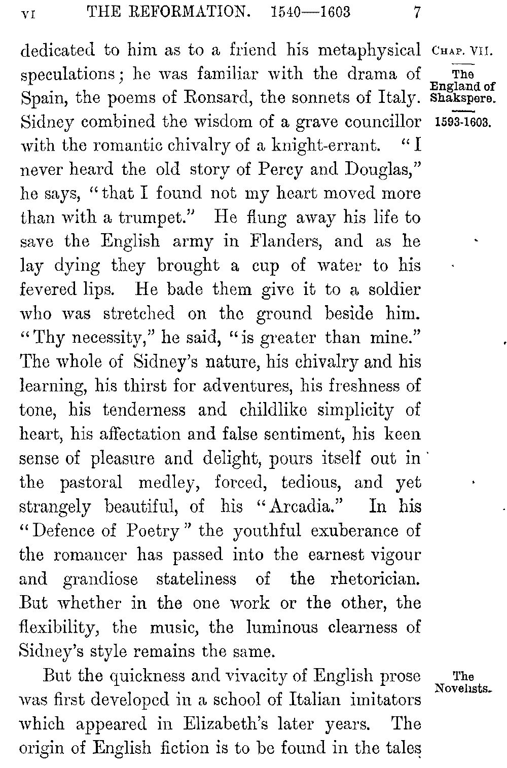 For a time Euphuism had it all its own way. Elizabeth was the most affected and detestable of Euphuists; and "that beauty in Court which could not parley Euphuism," a courtier of Charles the First's time tells us, "was as little regarded as she that now there speaks not French." The fashion however passed away, but the "Arcadia" of Sir Philip Sidney shows the wonderful advance which prose had made under its influence. Sidney, the nephew of Lord Leicester, was the idol of his time, and perhaps no figure reflects the age more fully and more beautifully. Fair as he was brave, quick of wit as of affection, noble and generous in temper, dear to Elizabeth as to Spenser, the darling of the Court and of the camp, his learning and his genius made him the centre of the literary world which was springing into birth on English soil. He had travelled in France and Italy, he was master alike of the older learning and of the new discoveries of astronomy. Bruno 5-007]dedicated to him as to a friend his metaphysical speculations; he was familiar with the drama of Spain, the poems of Ronsard, the sonnets of Italy. Sidney combined the wisdom of a grave councillor with the romantic chivalry of a knight-errant. "I never heard the old story of Percy and Douglas," he says, "that I found not my heart moved more than with a trumpet." He flung away his life to save the English army in Flanders, and as he lay dying they brought a cup of water to his fevered lips. He bade them give it to a soldier who was stretched on the ground beside him. "Thy necessity," he said, "is greater than mine." The whole of Sidney's nature, his chivalry and his learning, his thirst for adventures, his freshness of tone, his tenderness and childlike simplicity of heart, his affectation and false sentiment, his keen sense of pleasure and delight, pours itself out in the pastoral medley, forced, tedious, and yet strangely beautiful, of his "Arcadia." In his "Defence of Poetry" the youthful exuberance of the romancer has passed into the earnest vigour and grandiose stateliness of the rhetorician. But whether in the one work or the other, the flexibility, the music, the luminous clearness of Sidney's style remains the same.