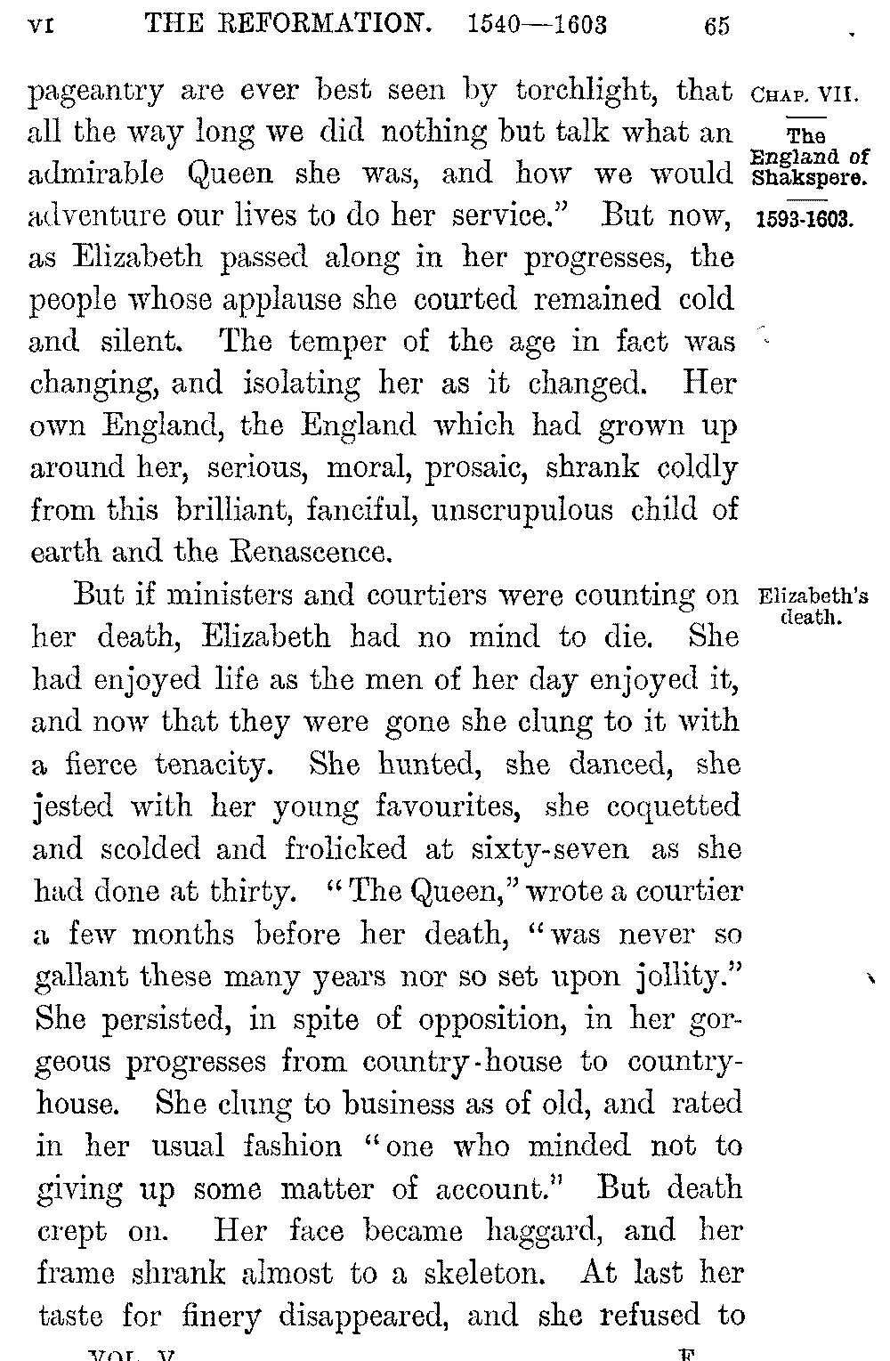 It is characteristic of England that the first kind of literature to rise from its long death was the literature of history. But the form in which it rose marked the difference between the world in which it had perished and that in which it reappeared. During the Middle Ages the world had been without a past, save the shadowy and unknown past of early Rome; and annalist and chronicler told the story of the years which went before as a preface to their tale of the present without a sense of any difference between them. But the religious, social, and political change which passed over England under the New Monarchy broke the continuity of its life; and the depth of the rift between the two ages is seen by the way in which History passes on its revival under Elizabeth from the mediæval form of pure narrative to its modern form of an investigation and reconstruction of the past. The new interest which attached to the bygone world led to the collection of its annals, their reprinting and embodiment in an English shape. It was his desire to give the Elizabethan 5-004]Church a basis in the past, as much as any pure zeal for letters, which induced Archbishop Parker to lead the way in the first of these labours. The collection of historical manuscripts which, following in the track of Leland, he rescued from the wreck of the monastic libraries created a school of antiquarian imitators, whose research and industry have preserved for us almost every work of permanent historical value which existed before the Dissolution of the Monasteries. To his publication of some of our earlier chronicles we owe the series of similar publications which bear the name of Camden, Twysden, and Gale. But as a branch of literature, English History in the new shape which we have noted began in the work of the poet Daniel. The chronicles of Stowe and Speed, who preceded him, are simple records of the past, often copied almost literally from the annals they used, and utterly without style or arrangement; while Daniel, inaccurate and superficial as he is, gave his story a literary form and embodied it in a pure and graceful prose. Two larger works at the close of Elizabeth's reign, the "History of the Turks" by Knolles, and Raleigh's vast but unfinished plan of the "History of the World," showed a widening of historic interest beyond the merely national bounds to which it had hitherto been confined.