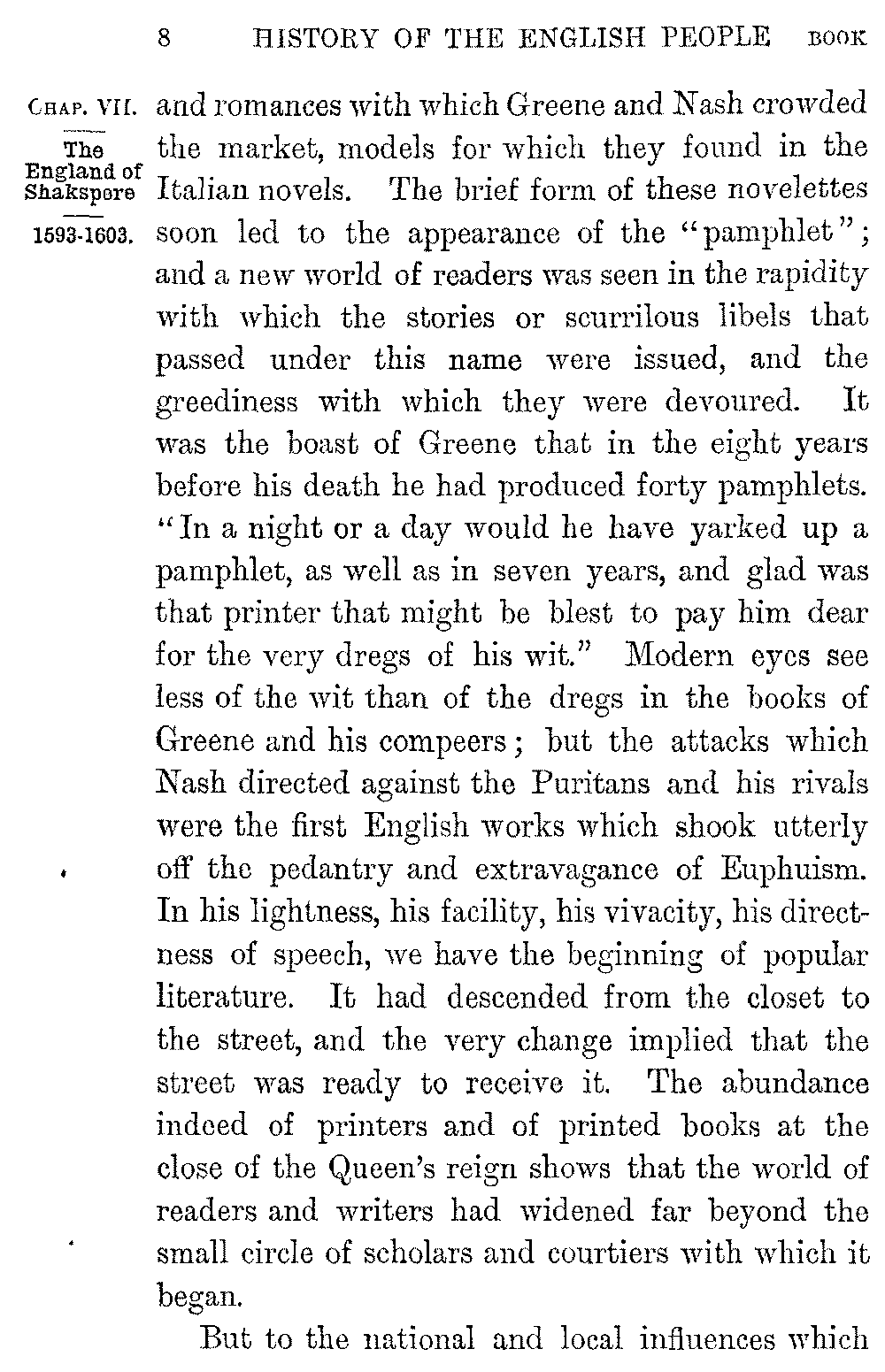 But the quickness and vivacity of English prose was first developed in a school of Italian imitators which appeared in Elizabeth's later years. The origin of English fiction is to be found in the tales 5-008]and romances with which Greene and Nash crowded the market, models for which they found in the Italian novels. The brief form of these novelettes soon led to the appearance of the "pamphlet"; and a new world of readers was seen in the rapidity with which the stories or scurrilous libels that passed under this name were issued, and the greediness with which they were devoured. It was the boast of Greene that in the eight years before his death he had produced forty pamphlets. "In a night or a day would he have yarked up a pamphlet, as well as in seven years, and glad was that printer that might be blest to pay him dear for the very dregs of his wit." Modern eyes see less of the wit than of the dregs in the books of Greene and his compeers; but the attacks which Nash directed against the Puritans and his rivals were the first English works which shook utterly off the pedantry and extravagance of Euphuism. In his lightness, his facility, his vivacity, his directness of speech, we have the beginning of popular literature. It had descended from the closet to the street, and the very change implied that the street was ready to receive it. The abundance indeed of printers and of printed books at the close of the Queen's reign shows that the world of readers and writers had widened far beyond the small circle of scholars and courtiers with which it began.