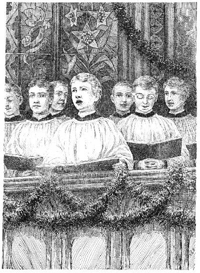 Suddenly a sound of music poured out into the bright air and drifted into the chamber. It was the boy choir singing Christmas anthems. Higher and higher rose the clear, fresh voices, full of hope and cheer, as children's voices always are. Fuller and fuller grew the burst of melody as one glad strain fell upon another in joyful harmony:—
