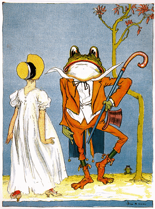 I do not suppose you have ever before heard of the Frogman, for like all other dwellers on that tableland he had never been away from it, nor had anyone come up there to see him. The Frogman was, in truth, descended from the common frogs of Oz, and when he was first born he lived in a pool in the Winkie Country and was much like any other frog. Being of an adventurous nature, however, he soon hopped out of his pool and began to travel, when a big bird came along and seized him in its beak and started to fly away with him to its nest. When high in the air the frog wriggled so frantically that he got loose and fell down—down—down into a small hidden pool on the tableland of the Yips. Now this pool, it seems, was unknown to the Yips because it was surrounded by thick bushes and was not near to any dwelling, and it proved to be an enchanted pool, for the frog grew very fast and very big, feeding on the magic skosh which is found nowhere else on earth except in that one pool. And the skosh not only made the frog very big, so that when he stood on his hind legs he was tall as any Yip in the country, but it made him unusually intelligent, so that he soon knew more than the Yips did and was able to reason and to argue very well indeed.