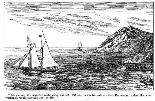 “Avast heaving,” cried the captain. “Loose sails.” In an instant the crew were aloft.