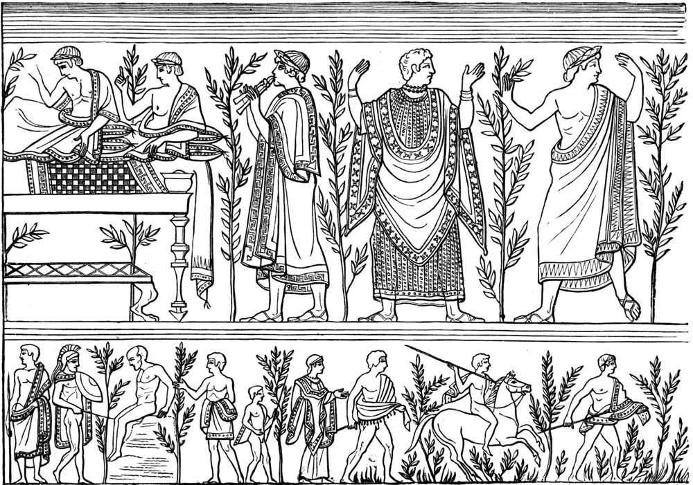 The Etruscan tombs which have been opened contain many beautiful objects of various kinds, and were frequently decorated with mural pictures. They often consist of several rooms, and have the appearance of being prepared as a home for the living rather than for the dead. I shall give you no long or wordy description of them; because if what I tell you leads you to wish to know more about them, there are many excellent books describing them which you can read. So I will simply give you two cuts from these Etruscan paintings, and tell you about them.