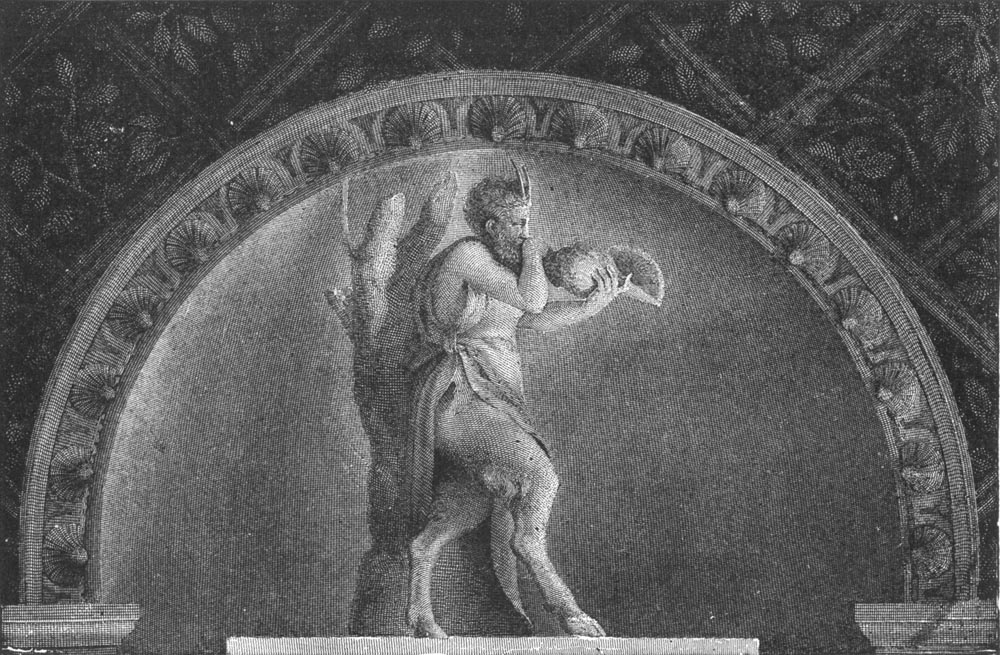 The painting of the early Romans was principally derived from or through the early Etruscans, and the Etruscans are believed to have first learned their art from Greek artists, who introduced plastic art into Italy as early as b.c. 655, when Demaratus was expelled from Corinth—and[Pg 21] later, Etruscan art was influenced by the Greek colonies of Magna Græcia. So it is fair to say that Etruscan art and early Roman art were essentially Greek art. The earliest artists who are known to have painted in Rome had Greek names, such as Ekphantos, Damophilos, and Gargasos. Later on in history there are painters mentioned with Latin names, but there is little of interest related concerning them; in truth, Ludius (who is also called by various authors Tadius and Studius) is the only really interesting ancient Roman painter of whom we know. He lived in the time of Augustus, and Pliny said of him: “Ludius, too, who lived in the age of the divine Augustus, must not be cheated of his fame. He was the first to bring in a singularly delightful fashion of wall-painting—villas, colonnades, examples of landscape-gardening, woods and sacred groves, reservoirs, straits, rivers, coasts, all according to the heart’s desire—and amidst them passengers of all kinds on foot, in boats, driving in carriages, or riding on asses to visit their country properties; furthermore fishermen, bird-catchers, hunters, vintagers; or, again, he exhibits stately villas, to which the approach is through a swamp, with men staggering under the weight of the frightened women whom they have bargained to carry on their shoulders; and many another excellent and entertaining device of the same kind. The same artist also set the fashion of painting views—and that wonderfully cheap—of seaside towns in broad daylight.”