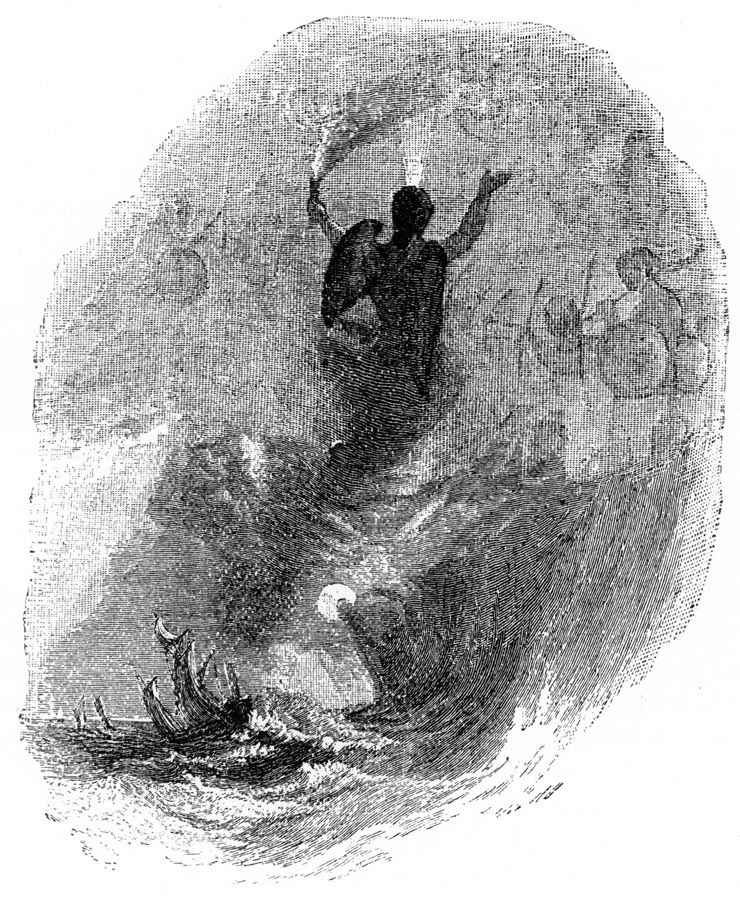 The story of Iphigenia says that when her father, King Agamemnon, killed a hart which was sacred to Diana, or Artemis, that goddess becalmed his fleet so that he could not sail to Troy. Then the seer, Calchas, advised the king to sacrifice his daughter in order to appease the wrath of Diana. Agamemnon consented; but it is said that the goddess was so sorry for the maiden that she bore her away to Tauris, and made her a priestess, and left a hart to be sacrificed instead of Iphigenia. In our cut you see Calchas on the right; two men are bearing the maiden to her doom, while her father stands on the left with his head veiled from sight (Fig. 4).
