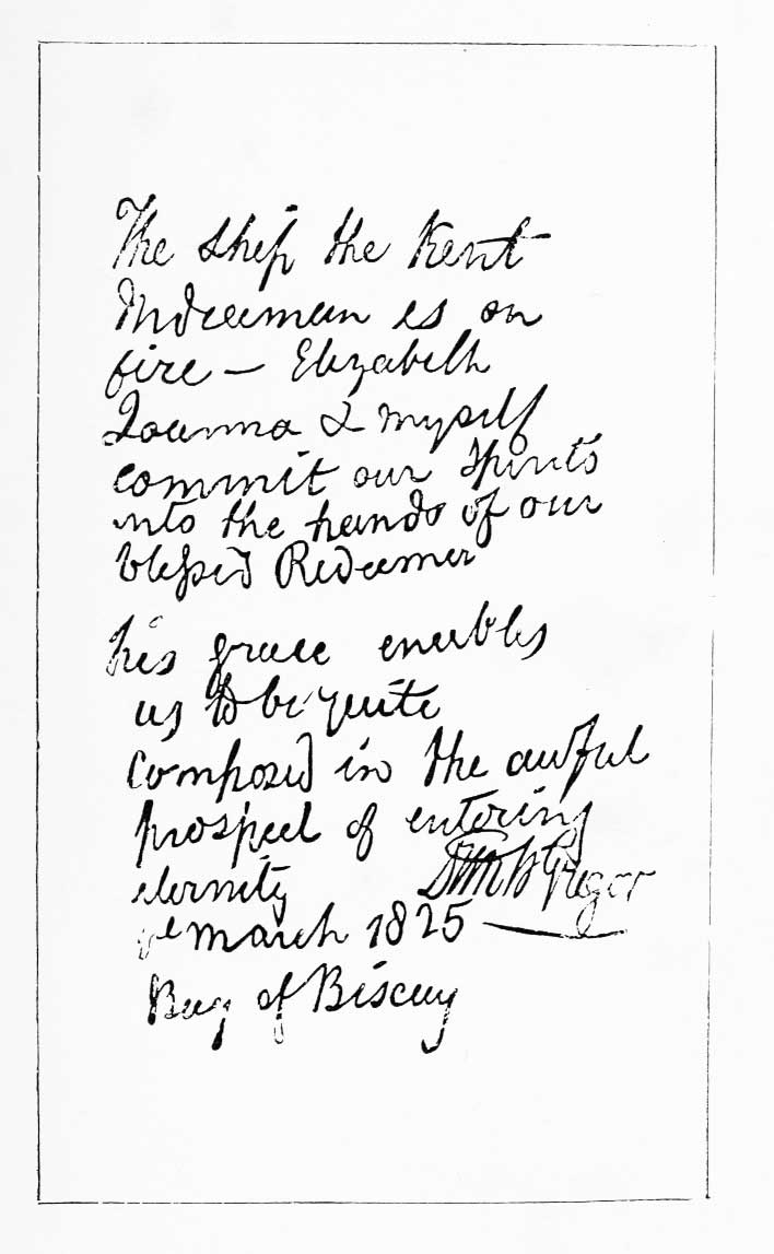 The upper deck was covered with between six and seven hundred human beings, many of whom, from previous sea-sickness, were forced, on the first alarm, to flee from below almost in a state of nakedness, and were now running about in quest of husbands, children, or parents. While some were standing in silent resignation, or in stupid insensibility to their impending fate, others were yielding themselves up to the most frantic despair. Some on their knees were earnestly imploring, with significant gesticulations and in noisy supplications, the mercy[Pg 16] of Him whose arm, they exclaimed, was at length outstretched to smite them; others were to be seen hastily crossing themselves, and performing the various external acts required by their peculiar persuasion; while a number of the older and more stout-hearted soldiers and sailors sullenly took their seats directly over the magazine; hoping, as they stated, that by means of the explosion which they every instant expected, a speedier termination might be put to their sufferings.[1] Several of the soldiers' wives and children, who had fled for temporary shelter into the after cabins on the upper decks, were engaged in prayer and in reading the Scriptures with the ladies; some of whom were enabled, with wonderful self-possession, to offer to others those spiritual consolations which a firm and intelligent trust in the Redeemer of the world appeared at this awful hour to impart to their own breasts. The dignified deportment of two young[Pg 17] ladies,[2] in particular, formed a specimen of natural strength of mind, finely modified by Christian feeling, that failed not to attract the notice and admiration of every one who had an opportunity of witnessing it. On the melancholy announcement being made to them that all hope must be relinquished, and that death was rapidly and inevitably approaching, one of the ladies above referred to, calmly sinking down on her knees, and clasping her hands together, said, "Even so, come, Lord Jesus," and immediately proposed to read a portion of the Scriptures to those around her. Her sister with nearly equal composure and collectedness of mind selected the forty-sixth and other appropriate Psalms, which were accordingly read, with intervals of prayer, by those ladies alternately to the assembled females.