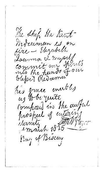 While we thus lay in a state of physical[Pg 21] inertion, but with all our mental faculties in rapid and painful activity—with the waves lashing furiously against the sides of our devoted ship, as if in anger with the hostile element for not more speedily performing its office of destruction,—the binnacle, by one of those many lurches which were driving everything movable from side to side of the vessel, was suddenly wrenched from its fastenings, and all the apparatus of the compass dashed to pieces upon the deck; on which one of the young mates, emphatically regarding it for a moment, cried out with the emotion so natural to a sailor under such circumstances, "What! is the Kent's compass really gone?" leaving the bystanders to form, from that omen, their own conclusions. One promising young officer of the troops was seen thoughtfully removing from his writing-case a lock of hair, which he composedly deposited in his bosom; and another officer procuring paper and pens, addressed a short communication to his father, which was afterwards carefully enclosed in a bottle, in the hope that it might eventually reach its destination, with the view, as he stated, of relieving him from the long years of fruitless anxiety and suspense[Pg 22] which our melancholy fate would awaken, and of bearing his humble testimony, at a moment when his sincerity could scarcely be questioned, to the faithfulness of that God in whose mercy he trusted, and whose peace he largely enjoyed in the tremendous prospect of immediate dissolution.[3] It was at this appalling instant, when "all hope that we should be saved was then taken away," and when the letter referred to was about being committed to the waves, that it occurred to Mr. Thomson, the fourth mate, to send a man to the fore-top, rather with the ardent wish than the expectation, that[Pg 25][Pg 24][Pg 23] some friendly sail might be discovered on the face of the waters. The sailor, on mounting, threw his eyes round the horizon for a moment—a moment of unutterable suspense—and waving his hat exclaimed, "A sail on the lee bow!" The joyful announcement was received with deep-felt thanksgivings, and with three cheers, upon deck. Our flags of distress were instantly hoisted, and our minute guns fired; and we endeavoured to bear down under our three top-sails and fore-sail upon the stranger, which afterwards proved to be the Cambria,[4] a small brig of 200 tons burden, Captain Cook, bound to Vera Cruz, having on board twenty or thirty Cornish miners, and other agents of the Anglo-Mexican Company.