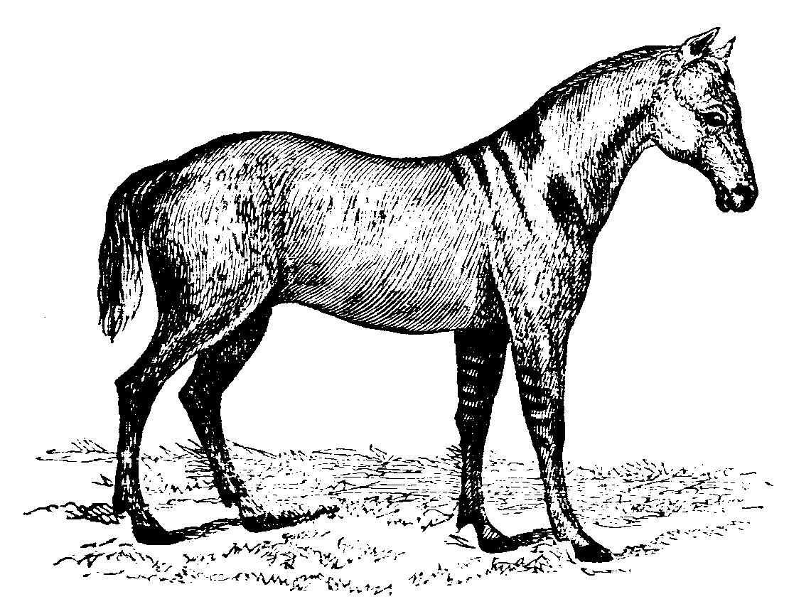 HORSE.—DIFFERENCES IN THE BREEDS—INDIVIDUAL VARIABILITY OF—DIRECT EFFECTS OF THE CONDITIONS OF LIFE—CAN WITHSTAND MUCH COLD—BREEDS MUCH MODIFIED BY SELECTION—COLOURS OF THE HORSE—DAPPLING—DARK STRIPES ON THE SPINE, LEGS, SHOULDERS, AND FOREHEAD—DUN-COLOURED HORSES MOST FREQUENTLY STRIPED—STRIPES PROBABLY DUE TO REVERSION TO THE PRIMITIVE STATE OF THE HORSE.