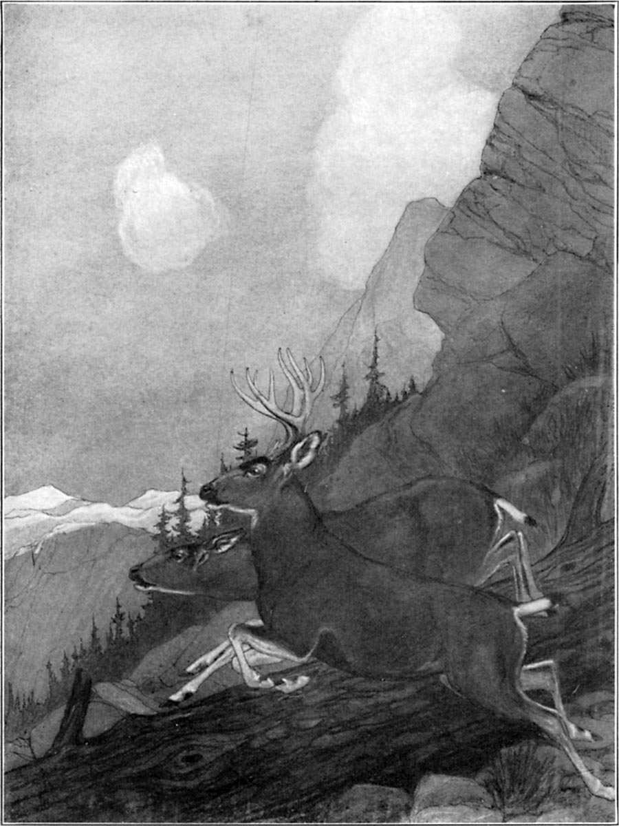 The yellow wolf sampled the cross currents of air which drifted in from each branching gulch. He crossed the cold trail scent of several deer but was in no mood for following a long trail so passed them by. It was the actual warm body scent he sought. He stopped suddenly with uplifted nose. The shifting breezes had carried the deer scent to his nostrils,—one brief flash and it was gone. Breed tacked back and forth across the wind, caught it again and held it, following the ribbon of scent upwind as easily as a man24 would follow a blazed trail through the timber. Two hundred yards from the start he sighted his prey, a fork-horn buck grazing slowly along under the trees. Breed turned his eyes to either side to determine the location of Cripp and Peg but they had suddenly vanished from sight.