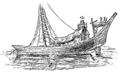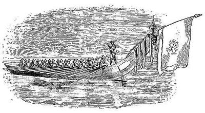 Le 1er août, au point du jour, toute l'ambassade, portée sur les bateaux plats le Sutlege et le Panlang, remorqués par le Bentinck et le Nerbudda, quitta cette ville et gagna le bras principal de l'Irawady.