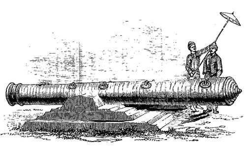 Nous débarquâmes et nous nous rendîmes à la résidence de Makertich. C'est une élégante construction en bambou, élevée sur piliers et entourée d'une palissade de même bois, selon la mode du pays. Une chambre tout à jour d'un côté, garnie de tapis indiens, servait de pièce de réception. Au fond de la salle, on voyait rangés sur un râtelier les fusils de la garde du gouverneur, qui habite, dans un coin de la cour, un petit corps de bâtiment, d'où les femmes regardaient curieusement les Kalàs (étrangers); les communs et les corps de garde étaient appuyés sur la clôture elle-même.