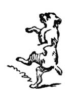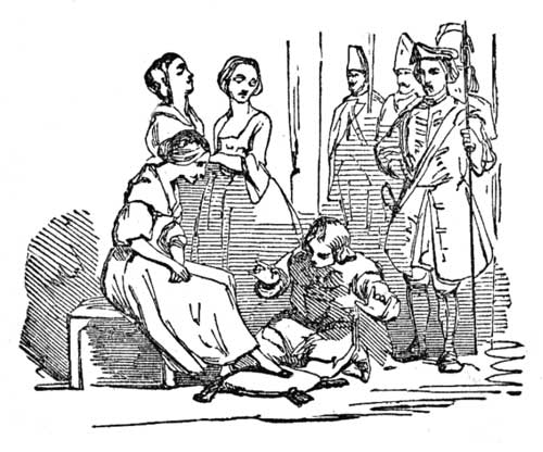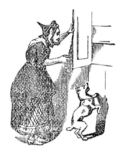 When the king came forth to meet her, accompanied by all his nobles, his peacocks, and the foreign ambassadors staying at his court, preceded by Rosetta's portrait at the end of a long pole, he was ready to die with rage and vexation on seeing such a fright; and, without more ado, he ordered her to be shut up, together with the nurse and the pilot, in the tower prison. His rage next fell upon the two princes, whom he accused of making game of him; and they were much surprised when, instead of being released on their sister's arrival, they were transferred to a horrible dungeon, where they remained up to their necks in water for three days. At the end of that time, the king of the peacocks came and insulted them through a loop-hole, and told them they were a couple of adventurers, whom he would have hung; upon which, the elder prisoner replied indignantly, that he was as good a king as himself, and that he might[Pg 45] some day repent his insolent behaviour. Seeing him so firm, the king of the peacocks had almost a mind to release them at once, and send them away with their sister, but one of his courtiers persuaded him that his dignity required he should punish the strangers; so he had them tried, and they were condemned to be executed for having told a falsehood, and promising the king a beautiful bride, who had turned out a horrible fright. When they heard this sentence, they protested so vehemently that there must be some misunderstanding, which time would clear up, that they obtained a week's respite. Meanwhile, the poor princess, who was greatly surprised on waking to find herself in the middle of the sea, began to weep bitterly, and fancied she had been cast into the waves by order of the king of the peacocks. After being tossed about for a couple of days, during which she would have died of hunger had she not chanced to pass near a bed of oysters, Fretillon's incessant barking attracted the notice of a good old man, who lived in a solitary hut on the shore. Thinking some travellers had lost their way, he came out to help them, when he was much surprised on beholding the princess in her water bed, calling out to him to save her life. The old man ran[Pg 46] back to fetch a grapple, and towed the bed ashore with some difficulty, and the princess having wrapt herself in the counterpane, followed him to his cottage, where he lit a fire, and gave her some clothes that once belonged to his late wife. Seeing that she must be a lady of high degree, by the richness of the bed-clothes, which were of satin, embroidered with gold and silver, the old man questioned her, and having learnt her story, he offered to go and inform the king of her arrival, reminding her that she would not have[Pg 47] proper fare in his poor house. But Rosetta would not hear of such a thing, and preferred borrowing a basket, which she fastened to Fretillon's neck, saying, “Go and fetch me pot-luck from the best kitchen in the town.” Fretillon set off; and, as there was no better than the king's, he stole all that was in the pot, and came back to his mistress. She then sent him back to the pantry to fetch bread, wine, and fruit. Now, when the king of the peacocks wanted to dine, there was nothing left, either in the pot or the pantry, so he was in a great rage, and he ordered some joints to be roasted, that he might, at least, make a good supper. But when evening came, the princess sent Fretillon to fetch some joints from the best kitchen, and the little dog again went to the palace, and, whipping the joints off the spit while the cook's back was turned, he filled his basket and returned home. The king having missed his dinner, wished to sup earlier than usual, when again nothing was to be had, and he went to bed in a perfect fury. The same thing happened the next day, both at dinner and at supper, so that for three days the king never tasted a morsel; and this might have gone on much longer had not a courtier concealed himself in the kitchen, and disco[Pg 48]vered the four-footed thief, and followed him to the cottage. The king immediately ordered the inmates of the cottage and the dog to be taken into custody, and determined they should be put to death with the two strangers, whose respite was to expire on the morrow. He then entered the hall of justice to judge the culprits. The old man knelt before him, and told him Rosetta's whole story; and when the king cast his eyes upon her, and saw how beautiful she was, he jumped for joy, and untied the cords that bound her. Meantime the two princes were sent for, together with the nurse and her daughter; and when they had all met, Rosetta fell on her brothers' necks, while the guilty nurse and her daughter, and the pilot, knelt down to implore forgiveness. The king was so delighted that he pardoned them, and rewarded the old man handsomely, and insisted on his remaining in his palace. The king of the peacocks next did all he could to make up for the ill-usage the king and the prince had suffered. The nurse returned the bushel of golden crowns and Rosetta's fine clothes; and the wedding rejoicings lasted a whole fortnight. So everybody was satisfied, not forgetting Fretillon, who was fed with all sorts of dainties for the rest of his life.