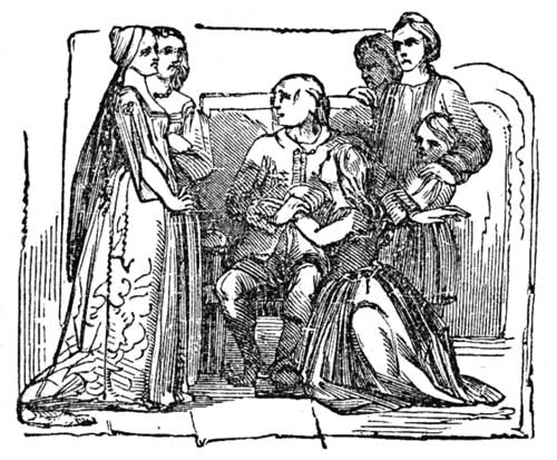 On reaching the capital, the king came forth to meet the Fair One with Golden Locks, and made her the most sumptuous presents. They were then married, amid great festivities and rejoicings; but the queen, who loved Avenant in her heart, could not forbear incessantly reminding the king, that had it not been for Avenant she would never have come, and that it was he alone who had procured her the water of beauty that was to preserve her ever youthful and beautiful. So it happened that some meddling bodies went and told the king that she preferred Avenant to himself, when he became so jealous that he ordered[Pg 95] his faithful subject to be thrown into prison, and fed upon nothing but bread and water. When the Fair One with Golden Locks heard of his disgrace, she implored the king to release him, but the more she entreated, the more obstinately his majesty refused. The king now imagined that his wife perhaps did not think him handsome enough, so he had a mind to try the effects of washing his face with the water of beauty. Accordingly, one night he took the phial from off the[Pg 96] mantel-piece in the queen's bed-chamber, and rubbed his face well before he went to bed. But, unfortunately, a short time previous the phial had been broken by one of the maids, as she was dusting, and, to avoid a scolding, she had replaced it by a phial which she found in the king's cabinet, containing a wash similar in appearance, but deadly in its effects. The king went to sleep, and died. Cabriole ran to his master to tell him the news, when Avenant bid him go and remind the queen of the poor prisoner. So Cabriole slipped in amongst the crowd of courtiers who had assembled on the king's death, and whispered to her majesty: “Do not forget poor Avenant.” The queen then called to mind all he had suffered on her account, and hastening to the tower, she took off his chains with her own white hands, and throwing the royal mantle over his shoulders, and placing a gold crown on his head, she said: “I choose you for my husband, Avenant, and you shall be king.” Everybody was delighted at her choice, the wedding was the grandest ever seen, and the Fair One with Golden Locks, and her faithful Avenant, lived happily to a good old age.[Pg 97]