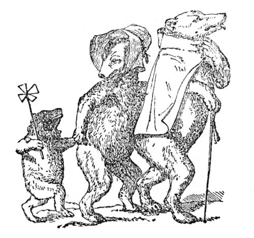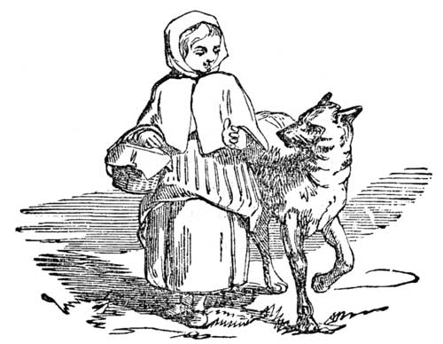 One day, when her mother had baked a batch of cakes, she said to Little Red Riding Hood: “I hear your poor grandam has been ailing, so, prithee, go and see if she be any better, and take her this cake and a little pot of butter.” Little Red Riding Hood, who was a willing child, and always ready to be useful, put the things into a basket, and immediately set off for the village where her grandmother lived, which lay on the other side of a thick wood. As she reached the outskirts of the forest, she met a wolf,[Pg 52] who would have liked vastly to have devoured her at once, had there not been some woodcutters near at hand, whom he feared might kill him in turn. So he sidled up to the little girl, and said, in as winning a tone as he could assume: “Good morning, Little Red Riding Hood.” “Good morning, Master Wolf,” answered she, who had no idea of being afraid of so civil spoken an animal. “And pray where may you be going so early?” quoth the wolf. “I am going to my grandmother's,” replied Little Red Riding Hood, who thought there could be no harm in telling him. “And[Pg 53] what are you carrying in your basket, my pretty little maid?” continued the wolf, sniffing its contents. “Why, a cake and a pot of butter,” answered simple Little Red Riding Hood, “because grandmother has been ill.” “And where does poor grandmamma live?” inquired the wolf, in a tone of great interest. “Down beyond the mill, on the other side of the wood,” said she. “Well,” cried the wolf, “I don't mind if I go and see her too. So I'll take this road, and do you go through the wood, and we'll see which of us shall be there first.”