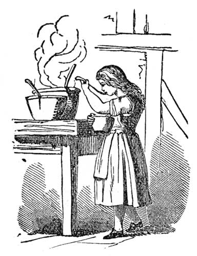 It happened that the merchant was suddenly ruined, and nothing was left of all his vast property but a[Pg 19] small house in the country, whither, he informed his children, they must now remove. The two eldest replied, that for their parts they need not leave town, as they had plenty of lovers who would be too happy to marry them even without a fortune. But here they were strangely mistaken. Their lovers would not even look upon them now; and, as they had made themselves odious by their pride, nobody pitied them for their fall, though every one felt sorry for Beauty. Indeed, several gentlemen offered to marry her, portionless as she was; but she told them she could not resolve to abandon her father in his misfortunes. The[Pg 20] family now removed into the country, where the father and his sons tilled the ground, while Beauty rose daily at four o'clock, and did all the work in the house. At first this drudgery seemed very hard, but after a time she grew stronger, and her health improved. When her work was over she read, played on the harpsichord, or sang as she sat at her spinning-wheel. As to her two sisters, they were perfectly helpless, and a burden to themselves. They would rise at ten, and spend the live-long day fretting for the loss of their fine clothes and gay parties, and sneer at their sister for her low-born tastes, because she put up with their unfortunate position so cheerfully.