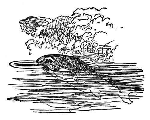 The next morning Cabriole woke up his master who dressed himself and went to take a walk. His feet insensibly carried him to the river side, when he heard a voice calling out: “Avenant! Avenant!” He looked about him, but seeing no one, was proceeding[Pg 90] on his way, when Cabriole, who was looking at the water, cried: “Why, master, as I'm alive, it is a golden carp that is hailing you.” Upon which the carp approached, saying: “You saved my life in the meadow, and I promised to be grateful. So here is the ring you are seeking for, gentle Avenant.”
