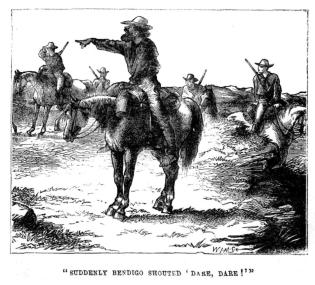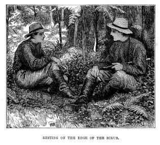 Harry agreed that his brother was very likely correct in his surmise, and, the ground being open, they again rode forward. Harry especially delighted in a hard gallop. By getting over the ground at an early hour, they might rest during the heat of the day under the shade of the myall trees—from which the creek took its name—and employ themselves in shaping a few stock whip-handles, which are made from its fragrant wood; they would then recommence their search for Old Bolter. Once having found him, there would be no stopping until they had got him safe back into the paddock. An hour’s hard riding brought them up to Myall Creek, within the dry bed of which they hoped to find Bolter, provided he had not discovered their approach, when to a certainty he would be off to some other place of concealment. They had prudently brought provisions with them, and, having securely hobbled their horses so that they might feed close to them, they sat down beneath the shade of a tree