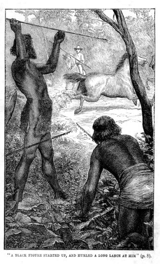 That Bolter would escape seemed very likely. He had got within a few yards of the scrub, when he suddenly wheeled round, almost on his haunches, and galloped back the way he had come. Scarcely had he done so, when a black figure started up from behind some bushes, and hurled a long lance at him, but the weapon merely grazed his side, and stuck in the ground.