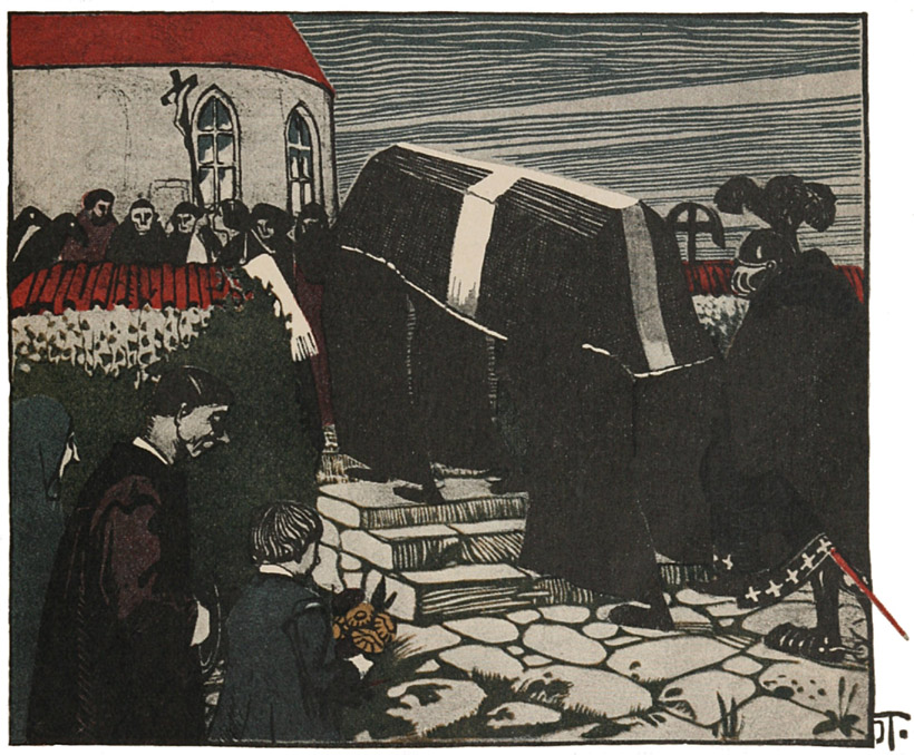 Ehe das Fräulein dem Gängelbande entwuchs, wurde die Prophezeiung der Nymphe an der guten Mutter erfüllt; sie erkrankte plötzlich und starb, ohne Zeit zu haben, an den Bisamapfel zu gedenken oder damit nach Verfügung der Nixe zu gunsten der kleinen Mathilde zu verfahren. Ihr Gemahl war eben abwesend, auf dem Turnier zu Augsburg und zog, mit einem Ritterdank von Kaiser Friedrich gekrönt, wieder nach Hause. Wie der Zwerg auf dem Turm seinen Herrn in der Ferne sah angeritten kommen, stieß er nach Gewohnheit ins Horn, dem Hofgesinde dessen Ankunft kundzutun; aber er ließ nicht wie sonst einen freudigen Ton erschallen, sondern posaunte gar eine traurige Melodei. Das fuhr dem Ritter durchs Herz und bekümmerte seine Seele. »Was für ein Schall,« sprach er, »gellt mir ins Ohr? Hört ihr’s, [12]ihr Knappen, ist das nicht Krähenruf und Totensang? Kleinhänsel verkündet uns nichts Gutes.« Und die Knappen waren alle bestürzt, sahen ihren Herrn traurig an und einer unter ihnen nahm das Wort und sprach: »Das ist die Weise des Vogels Kreideweiß, Gott wende Unglück ab; ’s ist eine Leiche im Hause!« Da spornte Wackermann seinen Hengst und ritt übers Blachfeld daher, daß die Funken stoben. Die Zugbrücke fiel, er sah gierig in den Schloßhof und erblickte leider das Leichenzeichen vor seiner Haustür ausgestellt, eine Laterne ohne Licht mit einem wehenden Flor geschmückt, und alle Fensterläden verschlossen. Dabei vernahm er von innen Schluchzen und Wehklagen des Gesindes, denn Frau Mathilde war eben aufgebahrt. Zu Häupten des Sarges saßen die beiden größern Töchter, in Boy und Flor gehüllt, und beweinten die erbleichte Mutter mit zahllosen Tränen. Am Fuße des Sarges saß die kleine Lieblingstochter; noch unvermögend, ihren Verlust zu empfinden, zerzupfte sie mit kindischer Gleichmütigkeit spielend die Überbleibsel der Blumen, womit die Leiche geschmückt war. Dieser wehmütige Anblick überwältigte Wackermanns männliche Standhaftigkeit, er weinte und jammerte laut, stürzte über den eiskalten Leichnam her, benetzte die bleichen [13]Wangen mit seinen Tränen, drückte mit zitterndem Munde die erstorbenen Lippen und überließ sich ohne Scheu allen schmerzhaften Gefühlen seines Herzens. Hernach hing er seine Waffen in die Rüstkammer auf, saß bedeckt mit einem abgekrempten Hut und einem schwarzen Trauermantel beim Sarge, trug Leid um seine abgeschiedene Hausfrau und erwies ihr die letzte Ehre durch ein feierliches Totengepränge.