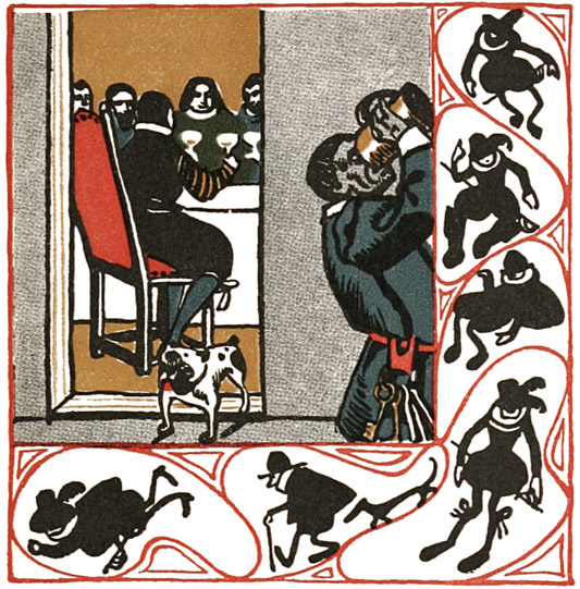 Wie Freund Hein, das Furchtgerippe mit der Sense, Paläste und Strohhütten durchwandert und alles, was ihm begegnet, unerbittlich mäht und würgt, so durchzog am Vorabend des Gastmahls Frau Gertrud, die unerbittliche Faust mit dem Schlachtmesser bewaffnet, Hühner- und Entenställe und trug als die Parze des Hausgeflügels Leben und Tod in ihrer Hand. Von ihrem blanken Würgestahl fielen die unbesorgten Bewohner bei Dutzenden, schlugen zum letztenmal ängstlich die Flügel, und Hühner und Tauben und dämische Kapaunen bluteten neben dem verbuhlten Puterhahn ihr Leben aus. Fräulein Mathilde bekam so viel zu rupfen, zu brühen und aufzuzäumen, daß sie die ganze Nacht den goldenen Schlaf entbehren mußte; doch achtete sie all der Mühe nicht, weil sie wußte, daß der Hochschmaus um ihrentwillen angerichtet wurde. Das Gastmahl begann, der fröhliche Wirt flog den Kommenden entgegen, und wenn der Türhüter schellte, wähnte er immer, die unbekannte Braut sei an der Tür; wurde sie aber geöffnet, so trat ein Prälat, eine feierliche Matrone oder ein ehrwürdig Amtsgesicht herein. Die Gäste waren lange beisammen und der Truchseß zögerte gleichwohl, die Speisen aufzutragen. Ritter Konrad [32]harrte noch immer auf die schöne Braut; als sie aber zu lange weilte, winkte er dem Truchseß mit geheimem Verdruß, die Tafel zu beschicken. Man setzte sich und befand, daß ein Gedeck zu viel war; niemand aber konnte erraten, wer die Einladung des Gastgebotes verschmäht hatte. Von Augenblick zu Augenblick verminderte sich die Fröhlichkeit des Gastgebers sichtbar, es war nicht mehr in seiner Gewalt, den Trübsinn von seiner Stirn zu bannen, so sehr er sich auch angelegen sein ließ, durch erzwungene Heiterkeit die Gäste bei Laune zu erhalten. Sauerteig säuerte gar bald den Süßteig der geselligen Freude, drum ging es im Tafelgemache bald so still und ernsthaft her wie bei einem Leichenessen. Die Geigen, die abends zum Tanz aufspielen sollten, wurden fortgeschickt, und so endete diesmal das Fest im Komterhof ohne Sang und Klang.