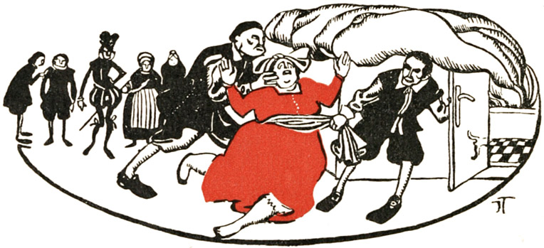 Alsbald fiel ein tiefer Schlaf auf das gesamte Hausgesinde, von der wachsamen Wirtschafterin an bis auf den Türhüter. Husch war Fräulein Mathilde zur Tür hinaus, wandelte ungesehen durch die Straßen und trat [26]mit dem Anstande einer Grazie in den Tanzsaal ein. Es wunderte sich männiglich über die Gestalt der holdseligen Jungfrau, und auf dem hohen Söller, der rings um den Saal lief, entstund ein flüsterndes Geräusch, wie wenn der Prediger auf der Kanzel Amen sagt. Einige bewunderten an der Unbekannten die Schönheit der Gestalt, andere den Geschmack der Kleidung, noch andere verlangten zu wissen, wer sie sei und von wannen sie käme, wiewohl kein Seitennachbar dem andern über diese Frage Auskunft geben konnte.