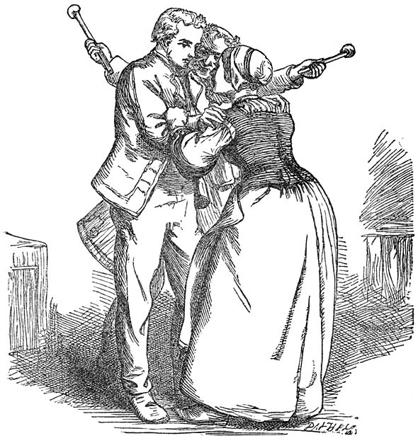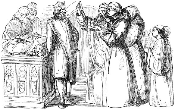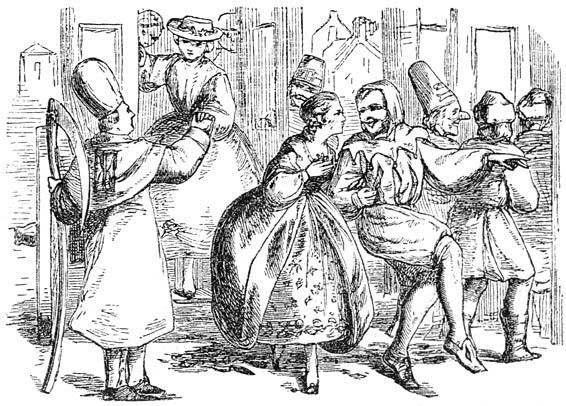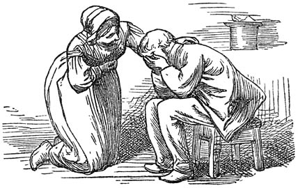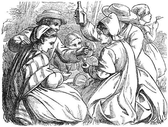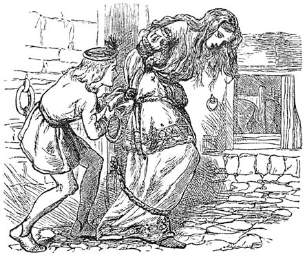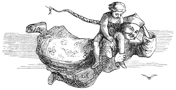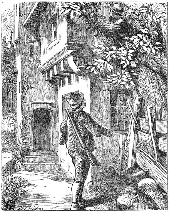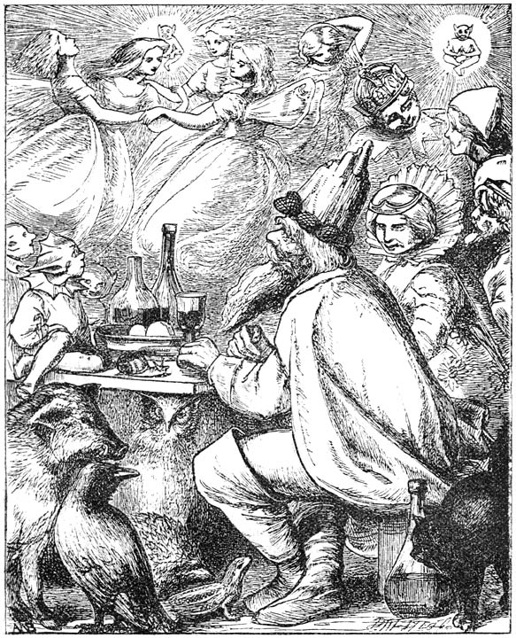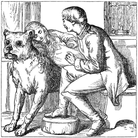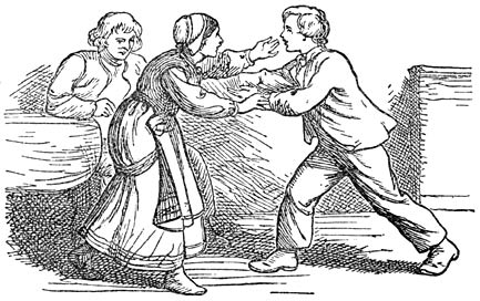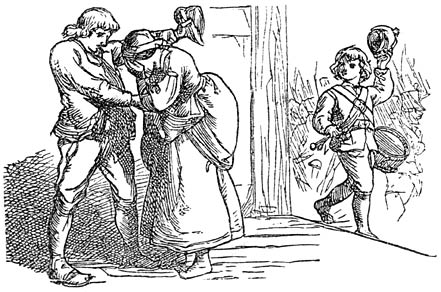 En zoo begaven zij zich naar de eendenkooi. Daarbinnen was een verschrikkelijk rumoer; want daar waren twee families, die elkaar het bezit van een palingkop betwistten, en eindelijk kreeg de kat dien toch.