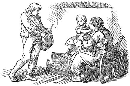 De kinderen wilden met hem spelen; maar het eendje dacht, dat zij hem kwaad wilden doen en vloog in zijn angst juist in het melkvat, zoodat de melk overal in de kamer rondspatte. De vrouw sloeg de handen in elkaar, waarop het eerst in het botervat en toen in de meelton vloog. Wat zag het er nu uit! De vrouw schreeuwde en sloeg met de tang naar het arme beest; de kinderen liepen elkaar omver, om het eendje te pakken; zij lachten en schreeuwden!—’t Was gelukkig, dat de deur openstond en dat het tusschen de takken in de versch gevallen sneeuw kon sluipen. Daar bleef het geheel uitgeput liggen.