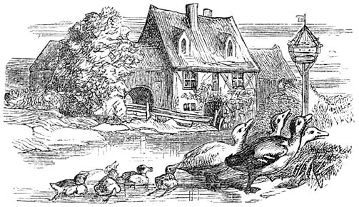 En dat deden zij; maar de andere eenden in de rondte bekeken ze en zeiden tegen elkaar: «Kijk eens! Nu moeten wij nog het [9]aanhangsel krijgen, alsof wij al niet talrijk genoeg waren! En foei! wat ziet dat eene eendje er uit! Dat willen wij hier niet hebben!» En terstond vloog er een oude eend naar het arme beest toe en beet het in den nek.