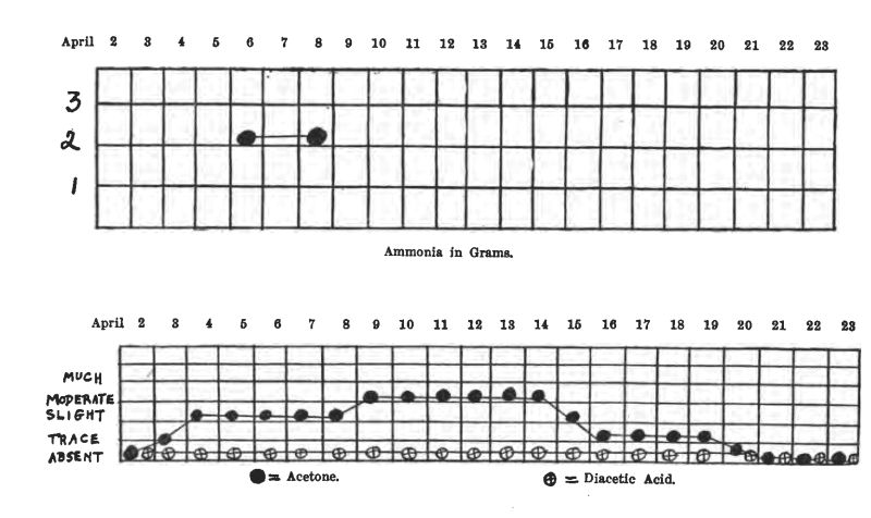 At entrance his ammonia was 1.7 grams per day; after the starvation days it ran from 0.9 grams to 0.3 grams per day. The acetone was a little stronger than at entrance; the diacetic absent except on three days.