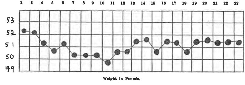 The first day of starvation the sugar dropped to 2.3%, and a slight trace of acetone appeared in the urine. The second day of starvation she was sugar-free, with a moderate acetone reaction. No soda bicarbonate was given. She lost 2 pounds during starvation. After she became sugar-free, her diets were as follows: