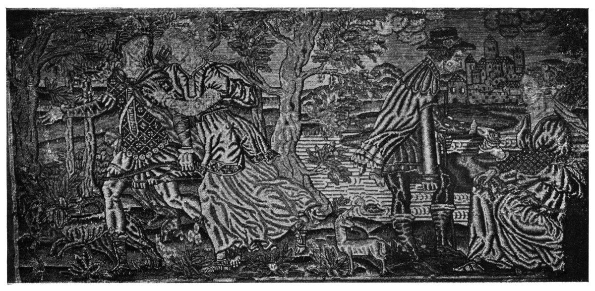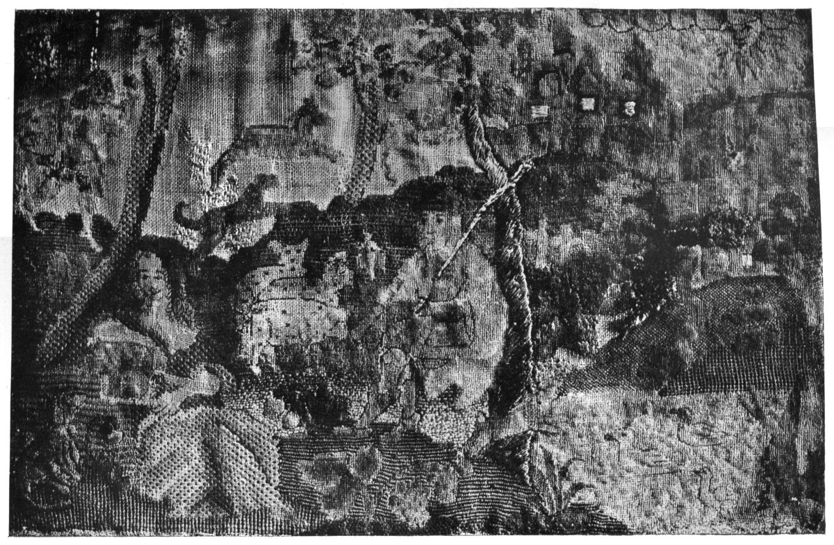 In the section devoted to embroideries, more particularly English (as it is with our own country's needlework I propose to deal), nothing more glorious in the Nation's art records can be found than the masterpieces of embroidery worked by the great ladies, the abbesses and nuns of the Mediæval period. In almost every other branch of art England has been equalled, if not excelled, by Continental craftsmen; but in this one instance, up to the Reformation, English work was sought after far and wide, and as opus Anglicum formed part of church furnishing and priestly vestments in every great cathedral in Italy, Spain, and France.