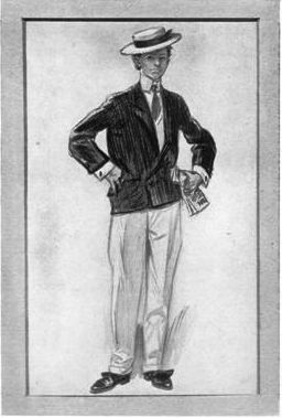 The longer the Prince worked the more clothes he bought. One of his most effective creations was a blue serge coat and vest, and a pair of white duck trousers linked by emotional red socks to patent-leather shoes. This confection, crowned with a wide, saw-edged straw hat with a blue band, made him the brightest bit of colour on the sombre streets of our dull town. He wore his collars so high that he had to order them of a drummer, and as he came down street from the depot, riding magnificently with the 'bus-driver, after the train had gone, the clerks used to cry: "Look out for your horses; the steam-piano is coming!"