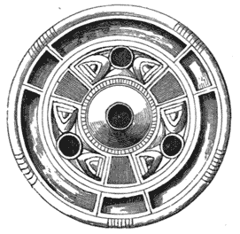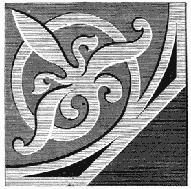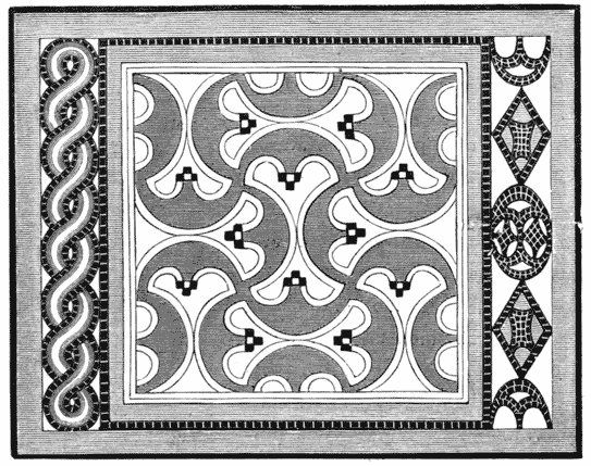 There is one class of ancient manufacturing art which has been revived for the use of the modern world with considerable success. We allude to the Roman works in mosaic, which have furnished designs for our encaustic tile-manufacturers and our floor-cloth painters. Quaint and peculiar in its necessary features, it is singularly well adapted for artisans in both materials. There is also a great variety in the ornamental details of ancient pavements, at home and abroad; the geometric forms being at times very peculiar, as in the specimen we give in the previous page (Fig. 6), which has been selected from one discovered at Aldborough, in Yorkshire (the Isurium Brigantum of the Romans), a lonely spot, containing many traces of its ancient importance, and which has furnished an abundance of relics for the notice of the antiquary from the days of Camden, who describes it with that happy brevity that accompanies full knowledge. The pavement we engrave may be seen in full coloured detail in Mr. Ecroyd Smith’s volume on[10] Isurium; the borders placed on each side are portions of other pavements from the same place, selected as showing the commonest and the most unusual patterns. The variety and beauty of design and colour in encaustic tiles adopted by mediævalists, may be slightly illustrated by the quaint specimen of foliation copied in Fig. 7. The conjunction of four such tiles produces great variety in pattern, and excellent contrasts of colour.