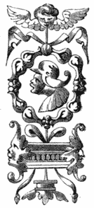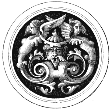 It was not, however, to be expected that any style should be resuscitated in all its purity without the admixture of some peculiarity emanating from the art which adopted it, and which was more completely the mode of the era. The Renaissance is, therefore, a Gothic classicality, engrafting classic form and freedom on the decorative quaintnesses of the middle ages. Fig. 1 is as pertinent a specimen as could be obtained of this characteristic: the Greek volute and the Roman foliage are made to combine with the hideous inventions of monkery, the grotesque heads that[5] are exhibited on the most sacred edifices, and which are simply the stone records of the strife and rivalry that prevailed between monks and friars up to the date of the Reformation, and are therefore of great value to the student of ecclesiology and ecclesiastical history. In this instance they seem to typify death and hell, over whom the Saviour was victorious by his mortal agony: the emblems of which occupy the central shield, and tell with much simple force the story of man’s redemption. Mediæval art has not unfrequently the merit of much condensation of thought, always particularly visible in its choice of types by which to express in a simple form a precise religious idea, at once appealing to the mind of the spectator, and bringing out a train of thought singularly diffuse when its slight origin is considered.