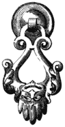 The highly-enriched knocker and door-handle (Fig. 36) were sketched from the original, on one of the ancient houses of the quaint city of Nuremberg. The bell-pull beside it (Fig. 37) is also from the same locality. There is probably no town in Germany where more artistic old iron-work is to be seen than in this place,—once the richest of trading communities, when Albert Durer flourished within its walls, and the Emperor Maximilian held royal state in its old castle. To all who would realise the chivalric days of the old German Empire, we would say, “Go to Nuremberg.”