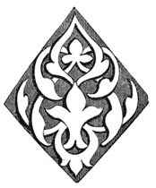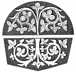 Wood panelling we have already alluded to, and the large amount of decoration it occasionally displayed. Fig. 13 is a beautiful instance of the grace that characterised the style known as the Flamboyant, from the flowing or flame-like curve adopted for the leading lines. In this instance they are happily blended with[13] the earlier Gothic cusps, and the quaint ivy-leaves that spring easily out of the severer lines. The ease with which heraldry may be introduced in the design, gave it a peculiar charm to our ancestors; in this instance the shields bear the sacred monograms—a purpose to which they were very commonly devoted in the church; sometimes being further enriched with religious emblems, as terse and striking as the heraldic ones we have given in a previous page.