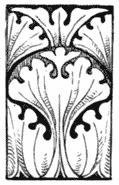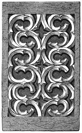 The easy applicability of the revived art to the taste for fanciful display which characterised the fifteenth century, led to its universal adoption in decoration; but the wilder imaginings of the living artist always tampered with the grand features of the design. The panel, Fig. 2, is an instance. The griffins have[6] lost their classic character, and have assumed the Gothic; the foliations are also subjected to the same process. The design is, however, on the whole, an excellent example of the mode in which the style appeared as a decoration in the houses of the nobility, whose love of heraldic display was indulged by the wood carver in panelled rooms rich with similar compartments.
