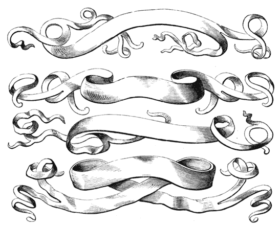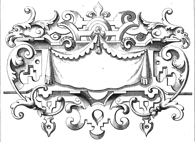 When the art of engraving aided the press in producing works [20]of a decorative order, we occasionally turn over pages in which the master-minds of the day taxed their powers of invention. The old wood-engravers were supplied by designers with drawings of the best class, and very quaint and original are the ornaments which embellish the books of the sixteenth and seventeenth centuries,—particularly such as were published in Germany, or at Lyons, the latter city being then most eminent for the taste and beauty of its illustrated volumes, the former for a bolder but quainter character of art. There are useful hints to be had in the pages of all, for such as would avail themselves of[21] minor book-ornament. To render our meaning more clear, we select a series of scrolls (Figs. 22-25) for inscriptions from German books, of the early part of the sixteenth century, and which might be readily and usefully adapted to modern exigencies, when dates or mottoes are required either by the painter or sculptor. Ornamental frameworks for inscriptions abound in old books, and are not unfrequently of striking design and peculiar elaboration; we give an example in Fig. 26, from a volume dated 1593, as an excellent specimen of this particular branch of design. Such[22] tablets not unfrequently headed the first page of a volume, and received in the centre the title of the book. The wood-engraver is thus the legitimate successor of the older illuminator.