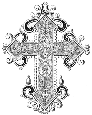 Perhaps no article of personal ornament has exhibited a greater variety of design and decorative enrichment than the cross. It has at once been made an embellishment and a badge of faith. We select in Fig. 29 one of singular elaboration and beauty, now the property of Lady Londesborough. It is a work[25] of the early part of the sixteenth century; the ground is of frosted gold, upon which is a foliated ornament in cloissonné enamel of various colours. It is also enriched with pearl and crystal; the lower part of this cross is furnished with a loop, from which a jewel of value might be suspended.
