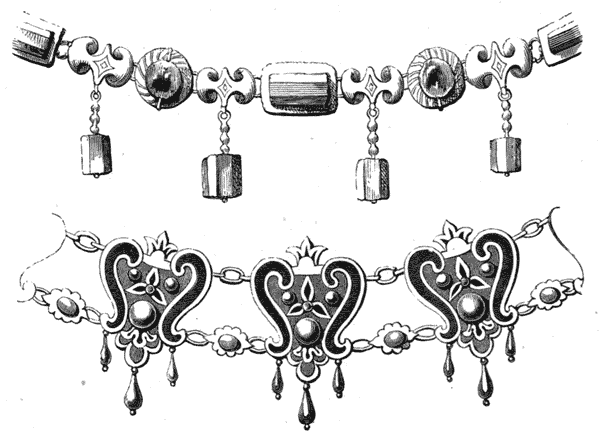 By way of curious contrast, as well as to show the style of various ages in the article of necklaces, we give, in Figs. 30 and 31, two examples of widely different eras. The upper one is that of a Roman lady, whose entire collection of jewellery was accidentally discovered at Lyons, in 1841, by some workmen who were excavating the southern side of the heights of Fourvières, on[26] the opposite side of the Seine. From an inscribed ring and some coins deposited in the jewel-box, the lady appears to have lived in the time of the Emperor Severus, and to have been the wife of one of the wealthy traders, who then, as now, were enriched by the traffic of the Rhone. The necklace we engrave is of gold, set with pearls and emeralds; the cubical beads are cut in lapis lazuli, as are the pendants which hang from others. This love of pendent ornament was common to all antique necklaces, from the days of ancient Greece to the end of the sixteenth century. Our second specimen is an illustration of this: it is copied from the portrait of a lady (bearing date 1593), and composed of a series of enamelled plaques, with jewels inserted, connected with each other by an ornamental chain.