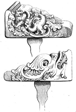 The examples of Renaissance given in our pages exhibit a fair average of its applicability. The pendent ornament (Fig. 40) includes details adopted by jewellers. The shield, with the sacred monogram (Fig. 41), is such as appeared in wood-panelling. The handle (Fig. 42) exhibits as much freedom of design as the style could admit; it is quaint and peculiar, but not without elegance in the mode of bringing the classic dolphin within the scope of the composition.